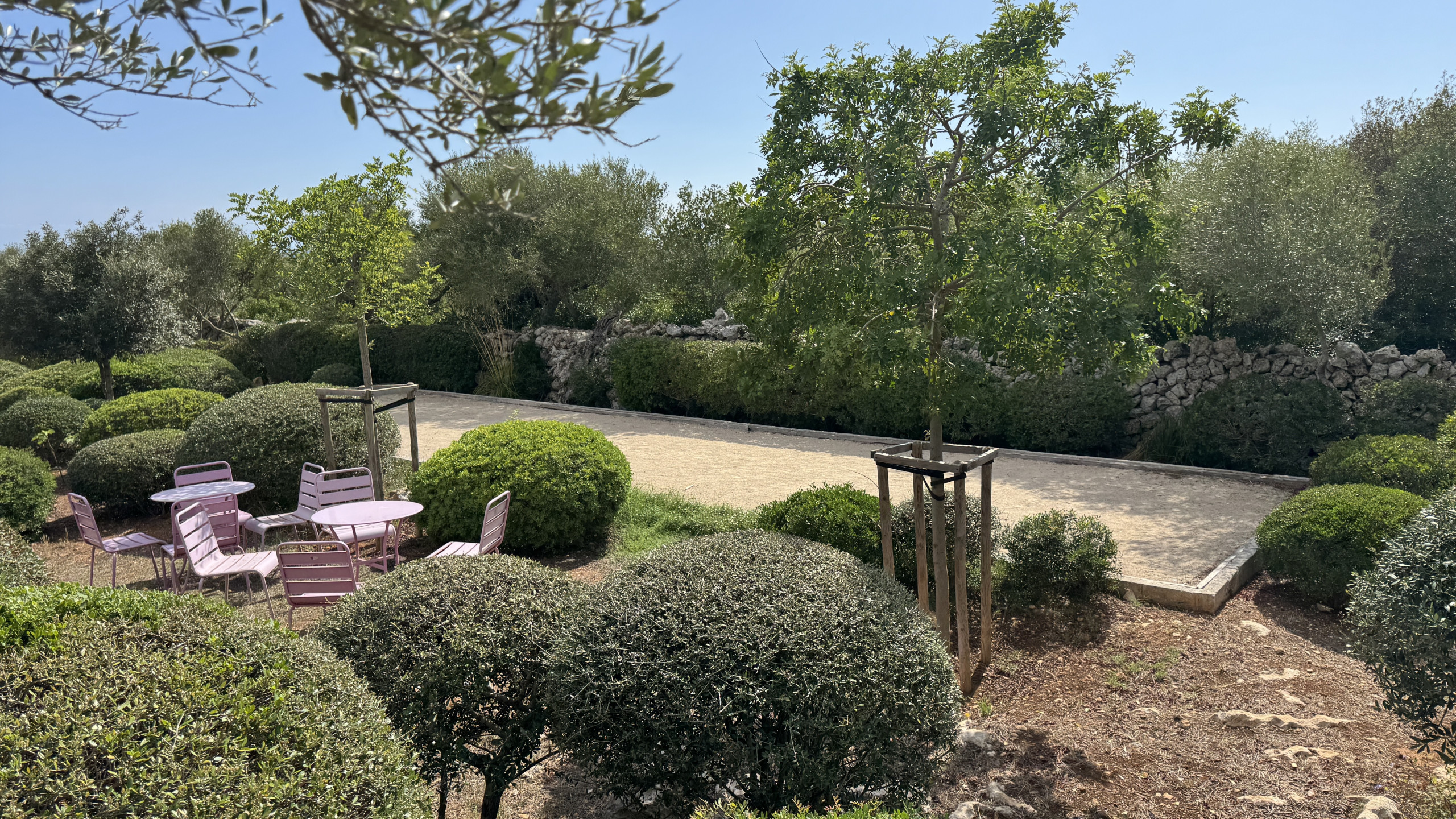 La propiedad tiene una gran extensión de terreno con muchos jardines y zonas de relax al sol o a la sombra. La piscina, que mide 18m x 4m, está rodeada de suelo de terraza, y goza de bonitas vistas al mar a través del campo. Cerca de la piscina hay una pista de petanca con mesa y sillas, y jardín con césped. El porche principal está conectado con el salón y la cocina, y está amueblado con grandes sofás y una amplia mesa con sillas para cenar al fresco. Adicionalmente, cada anexo tiene un pequeño porche amueblado también con una mesita y sillas.