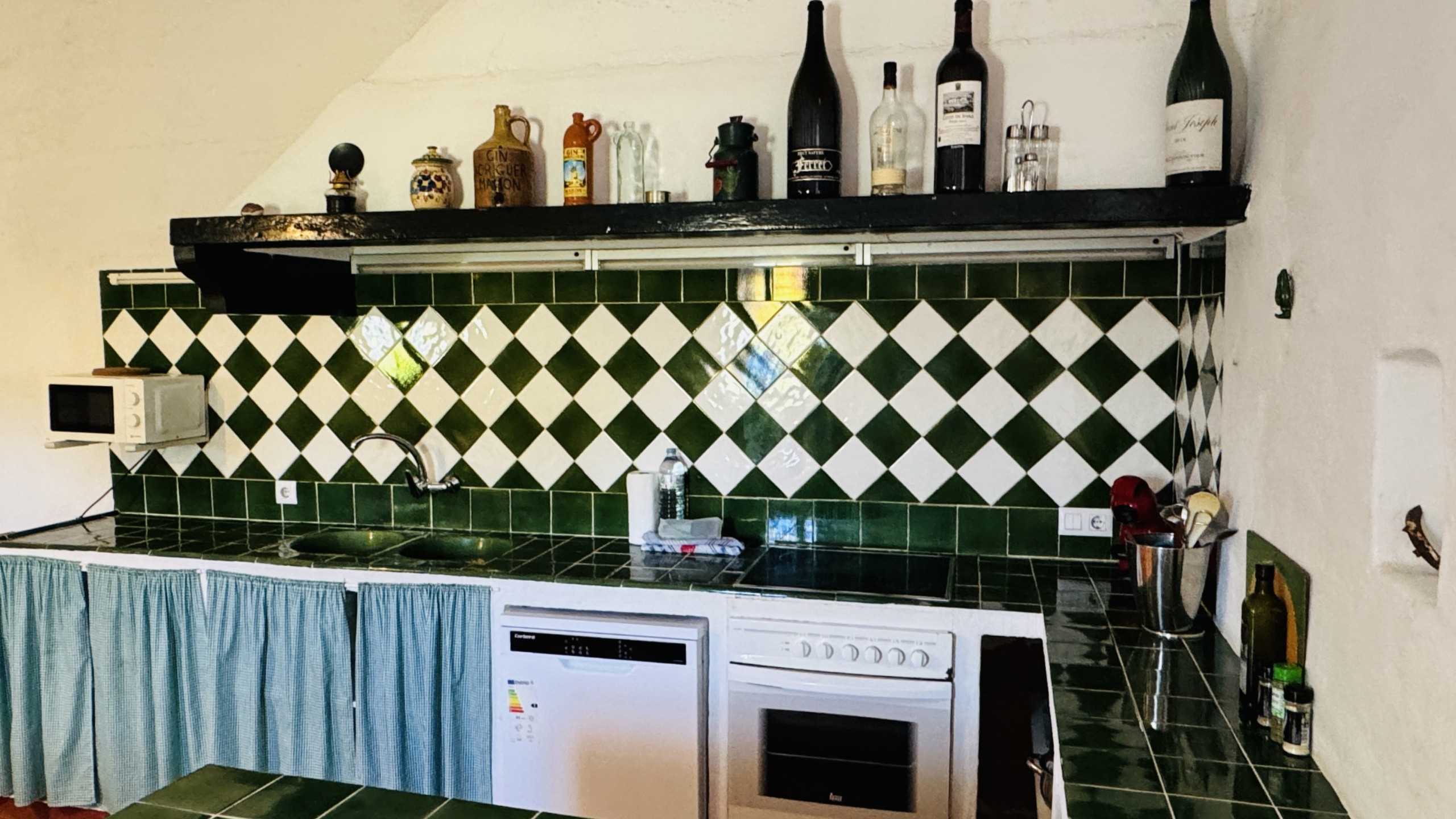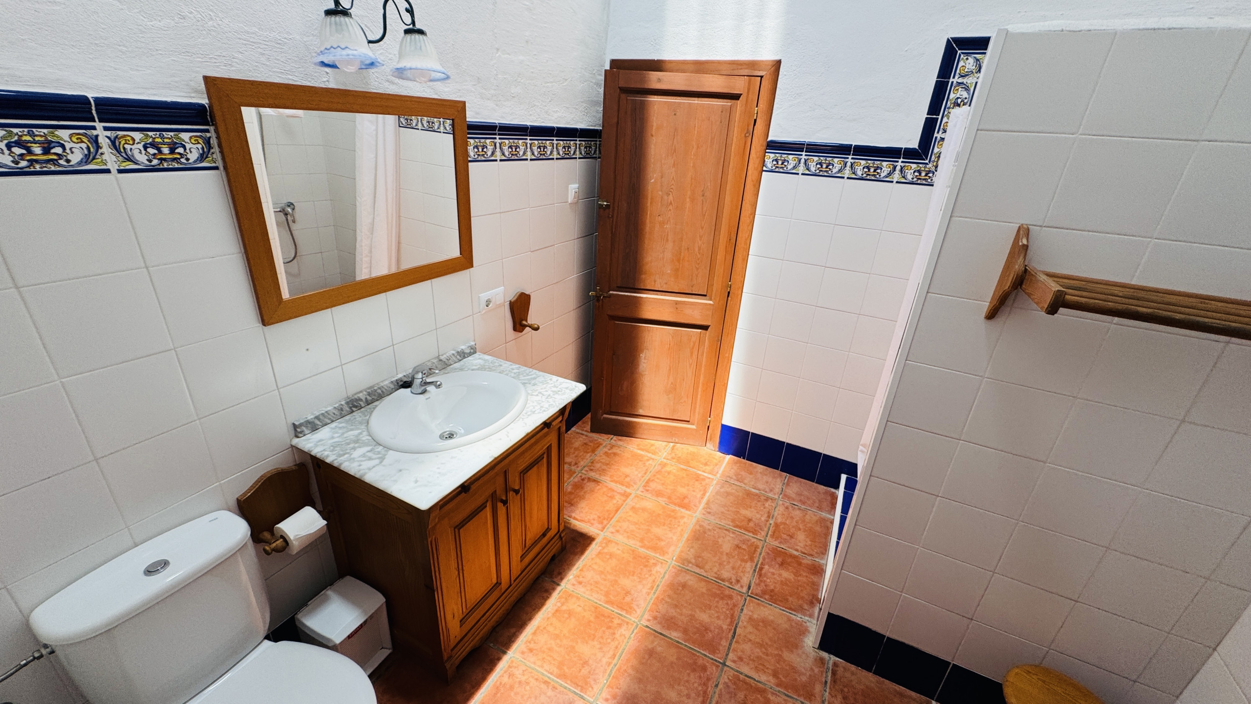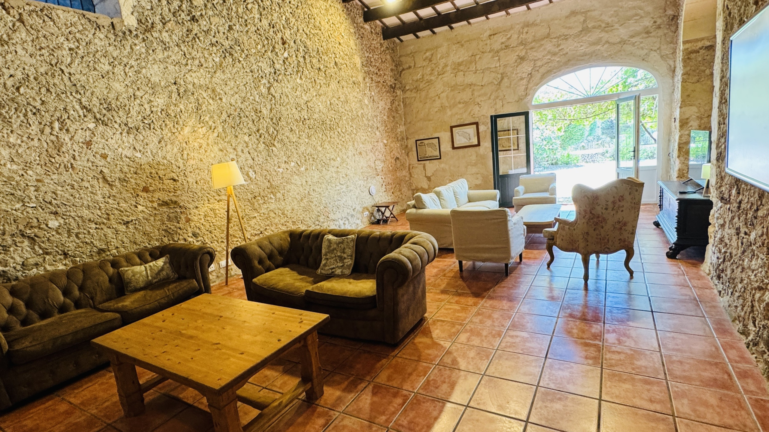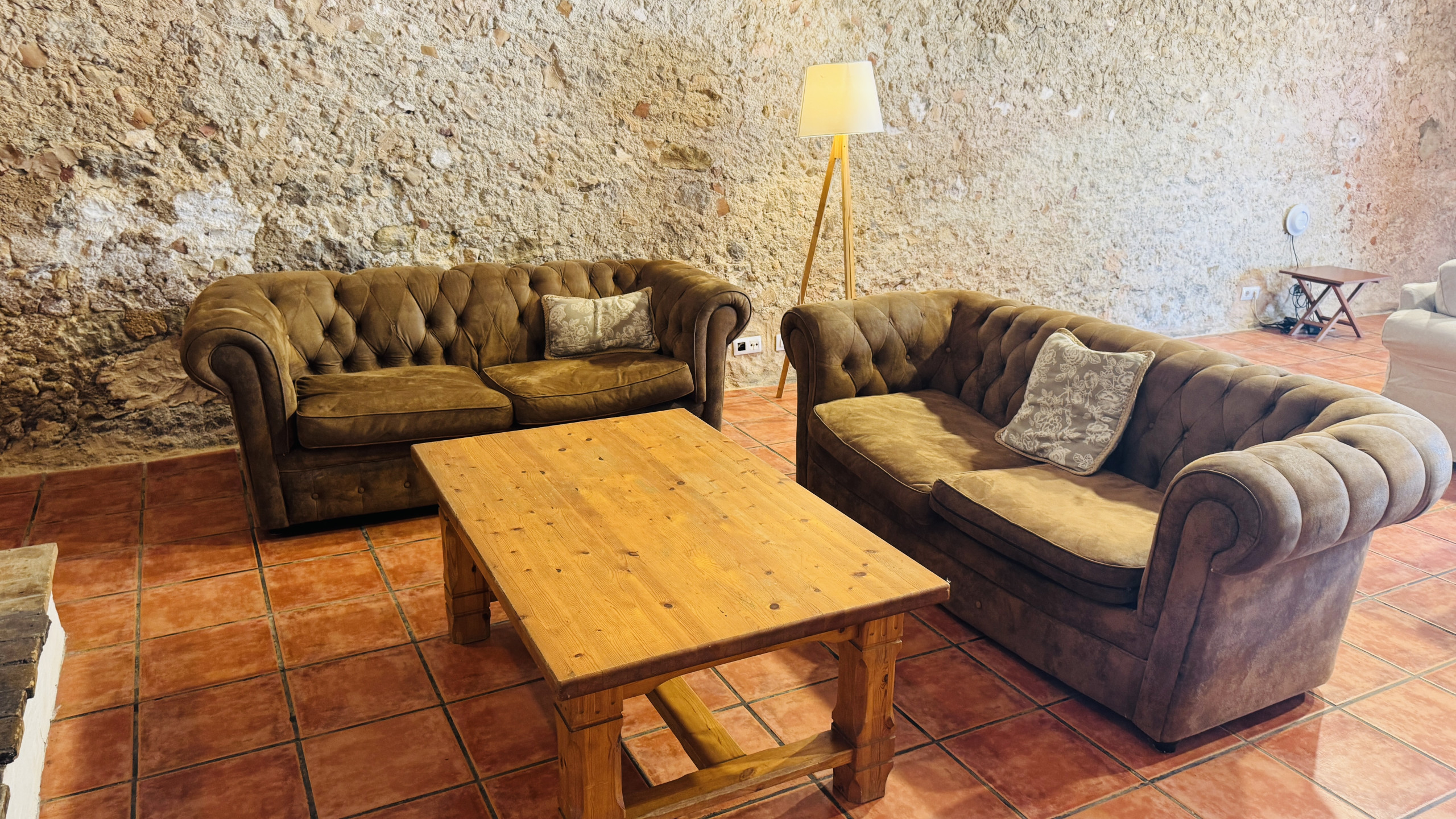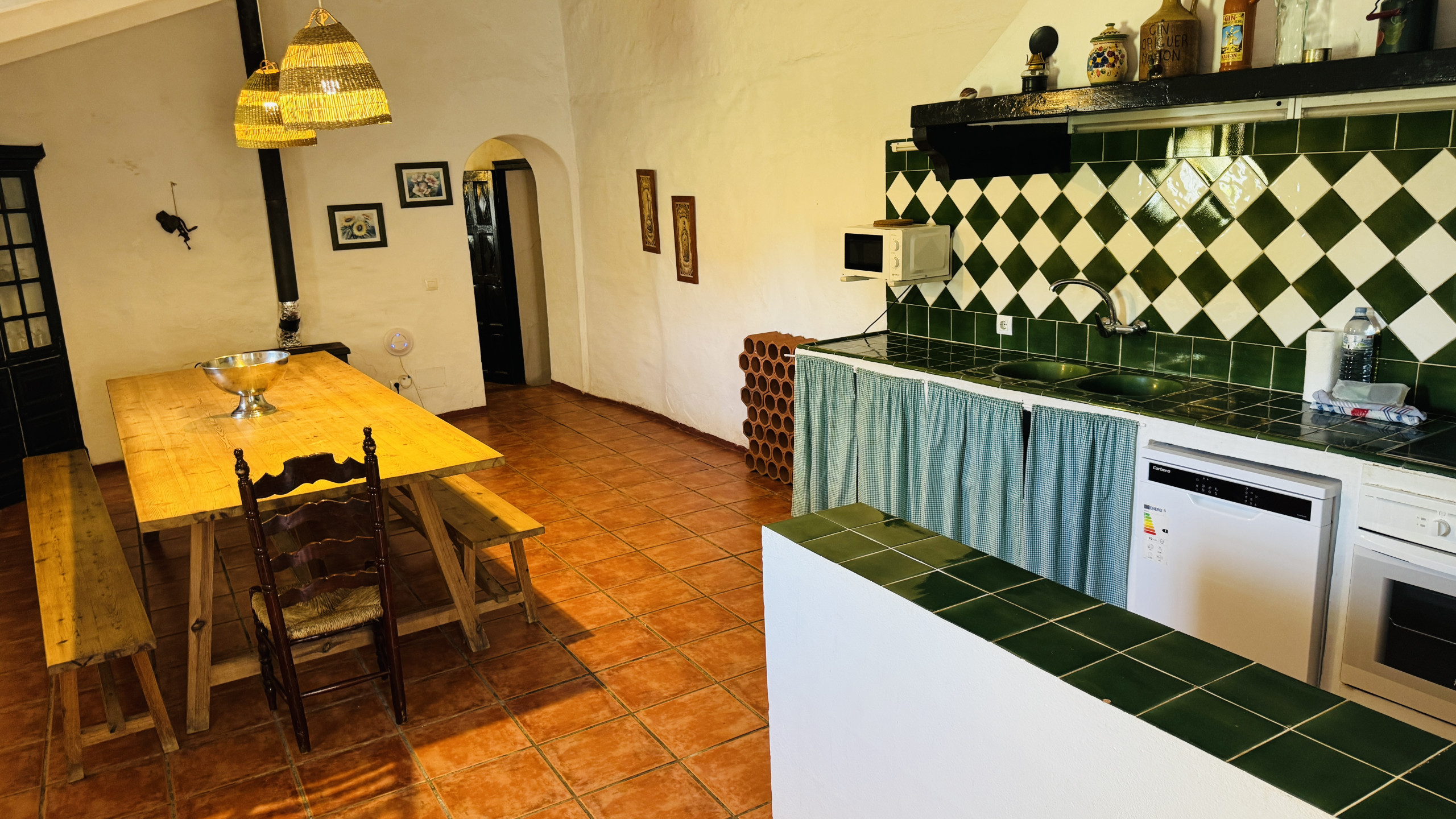 Distribución: espacioso salón principal (con altura de 5m y paredes de piedra) con acceso directo al exterior, amplio comedor, gran cocina típica menorquina con una "mesa tipo payés", 2 habitaciones dobles con plato de ducha en-suite, 2 habitaciones de matrimonio, 1 baño completo y 1 baño con ducha.