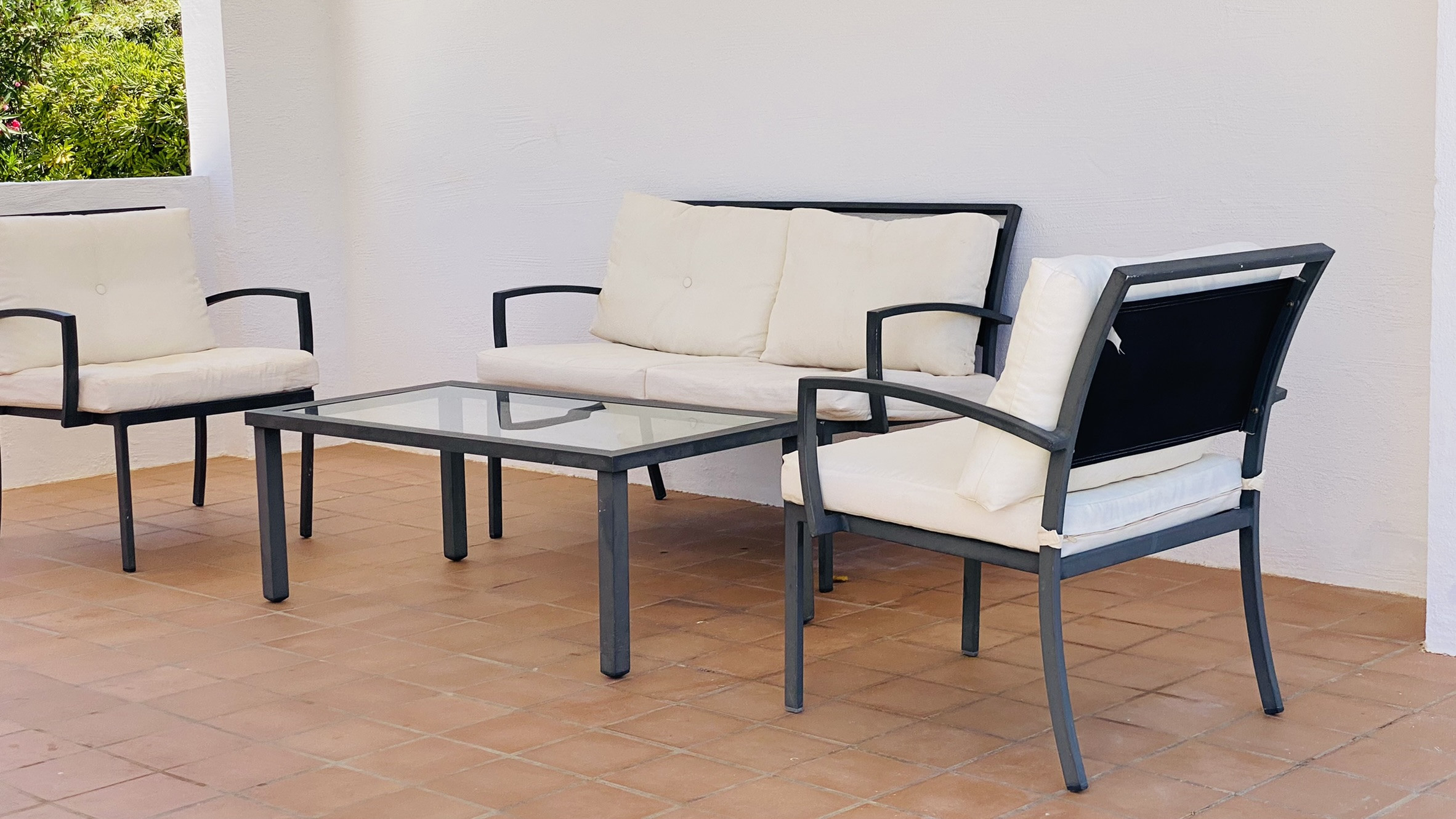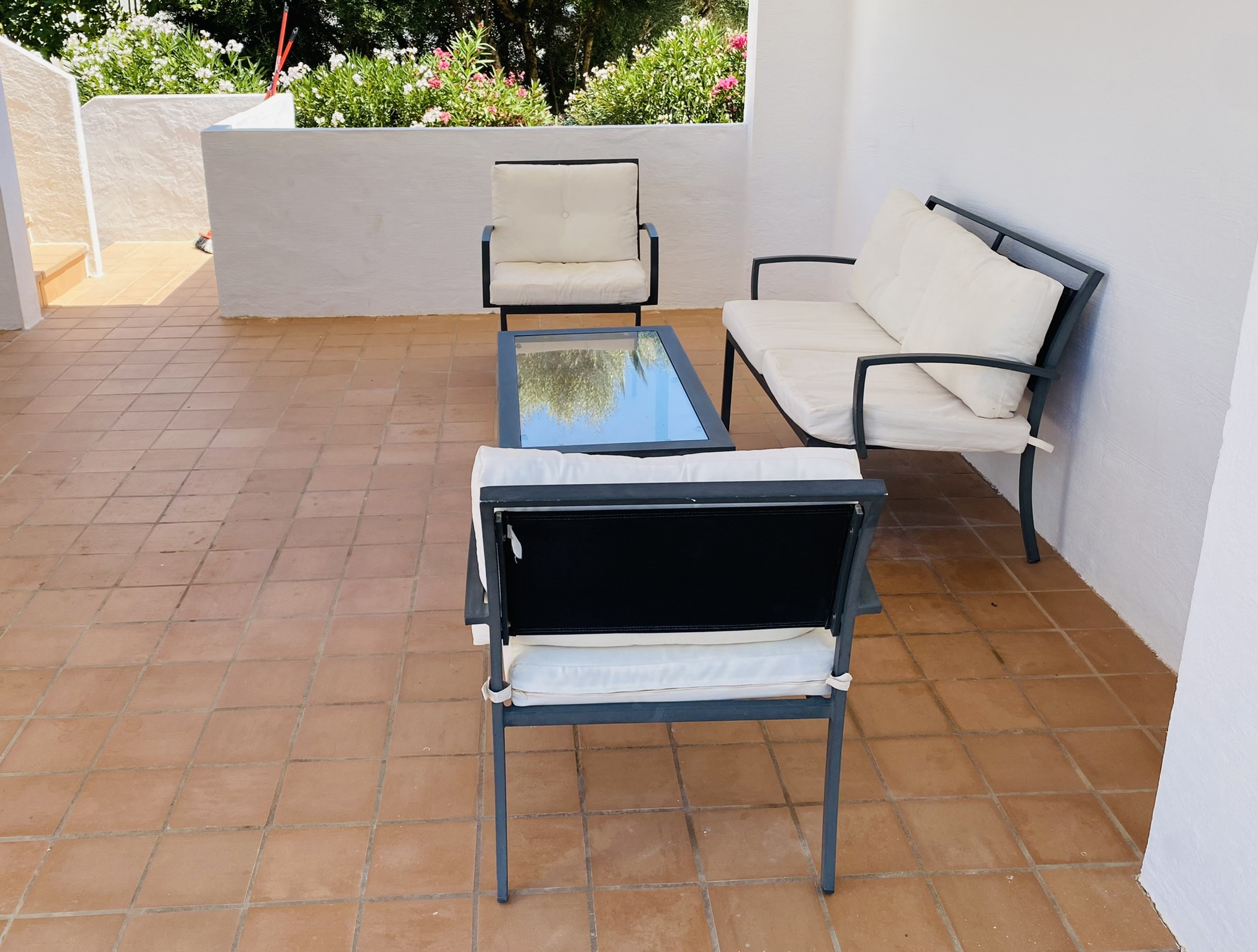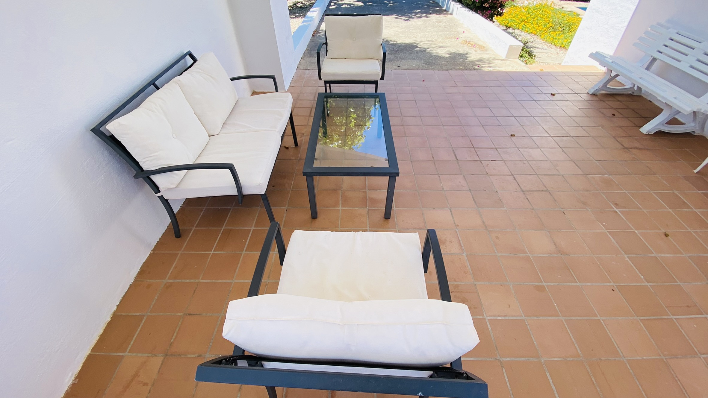 La casa cuenta con un porche con mesa y sillas para comer al aire libre y sofás para relajarse a la sombra. Tiene un área de césped artificial con vegetación autóctona y la piscina, de 7mx3m, está rodeada de suelo de terraza. Hay barbacoa de obra y porche para aparcar a la sombra.