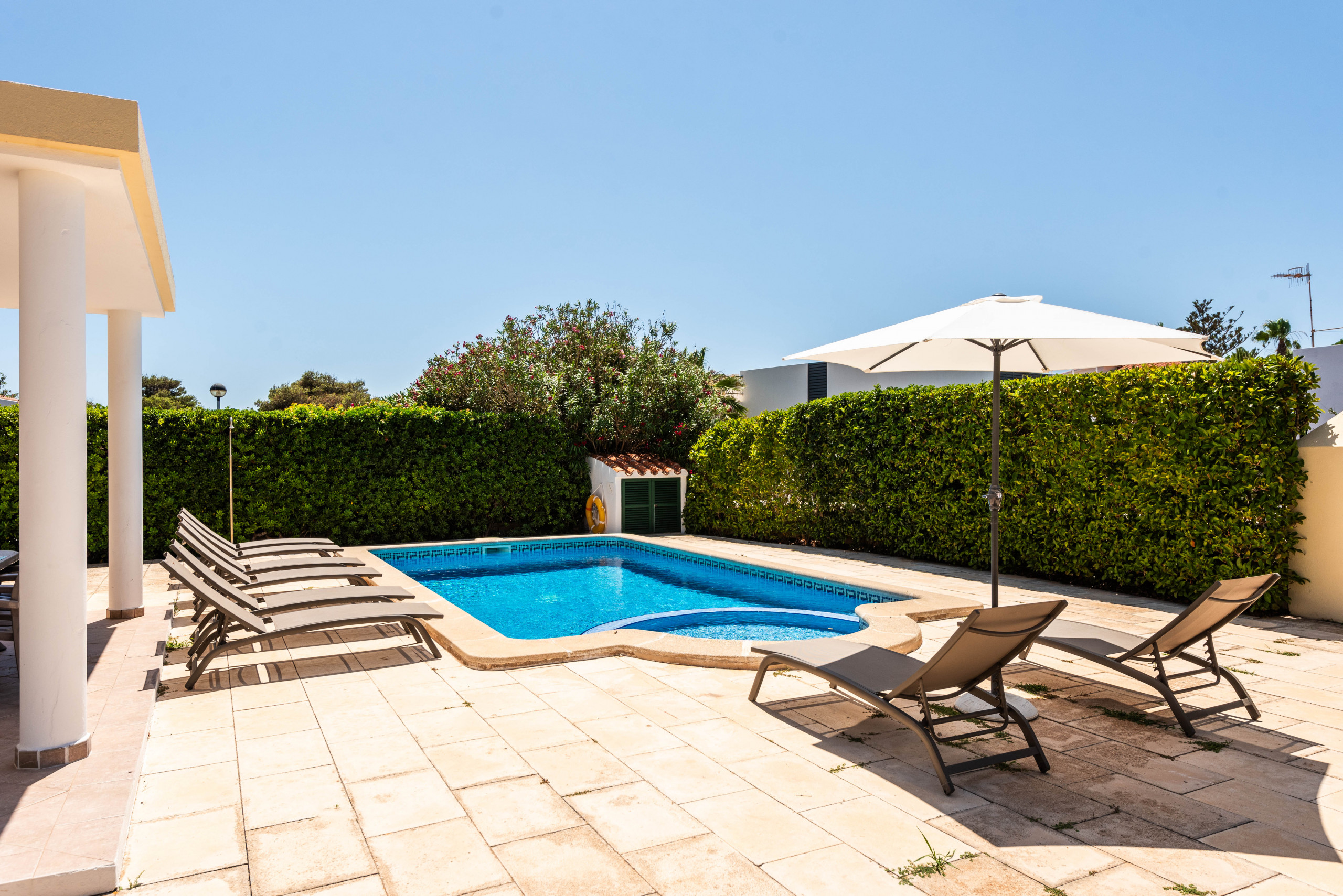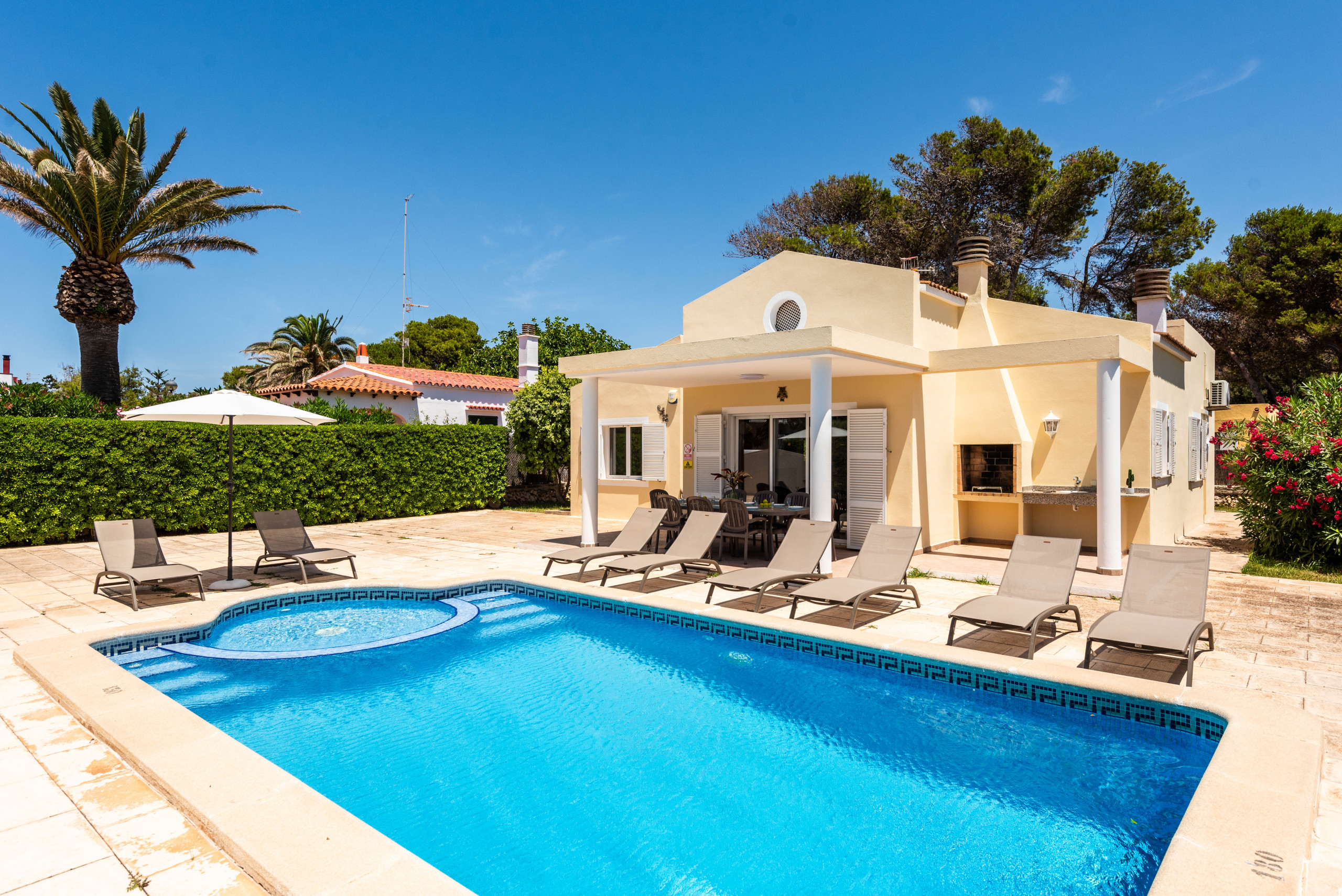 Preciosa y perfecta Villa para pasar sus vacaciones en CALA BLANCA, Menorca. Toda en planta baja, con 3 dormitorios dobles con Aire Acondicionado todas , 2 baños (uno en suite), salón comedor completo con TV Satélite, Wifi, cocina totalmente equipada. Perfecta para pasar los días en el exterior, gracias a su bonita piscina con escaleras interiores romanas, barbacoa de obra al lado de la piscina donde tenemos mesa y sillas para las comidas o cenas, zona de cesped, etc.... No lo duden, pasarán sus mejores vacaciones en Villa Cleo!