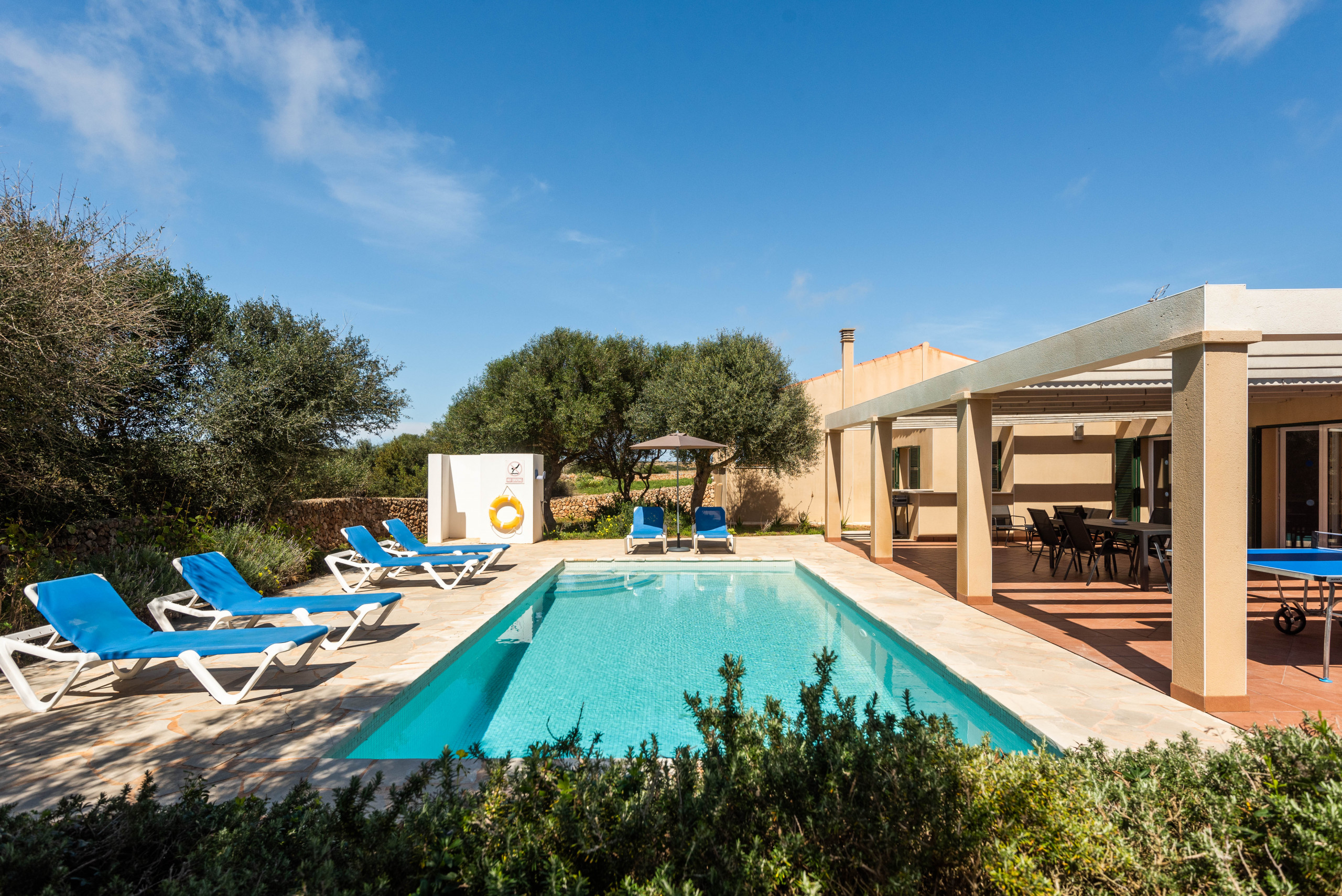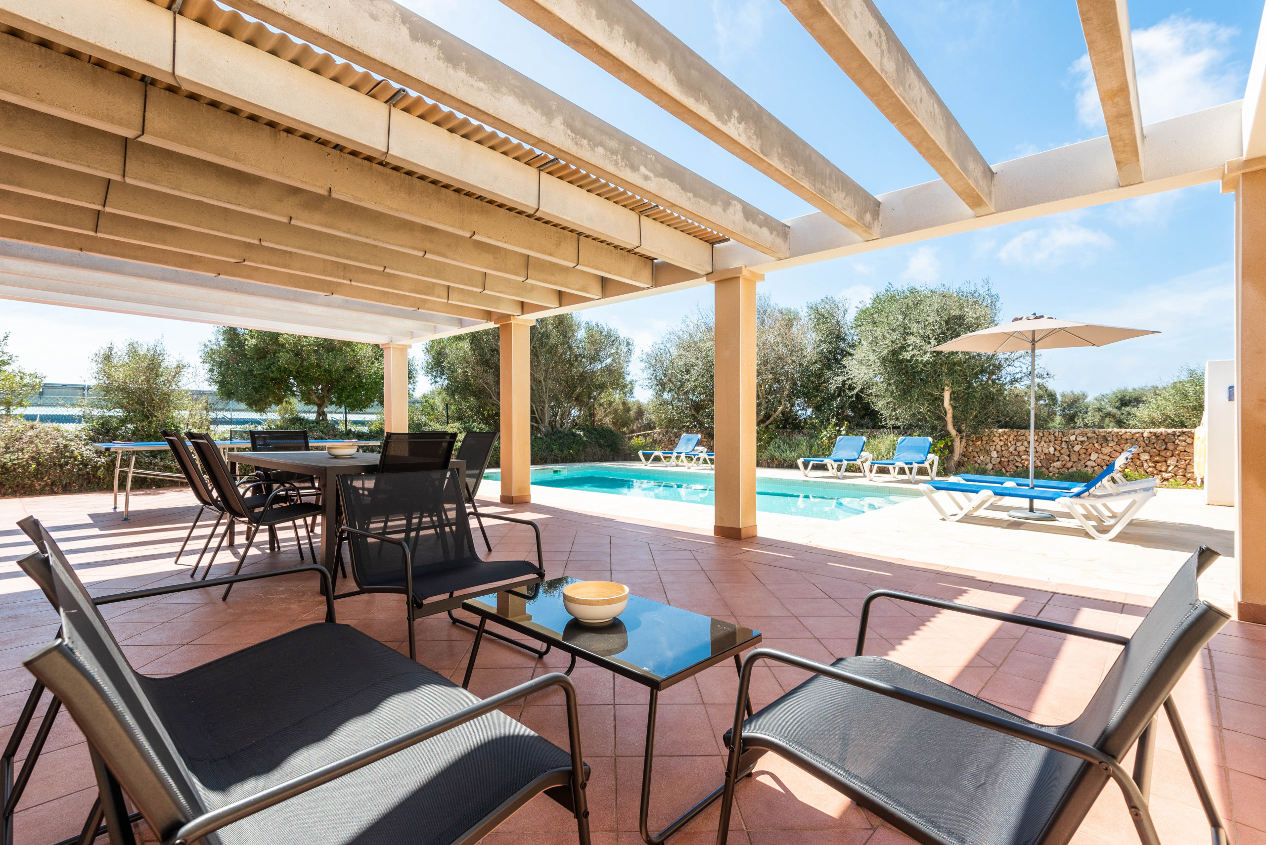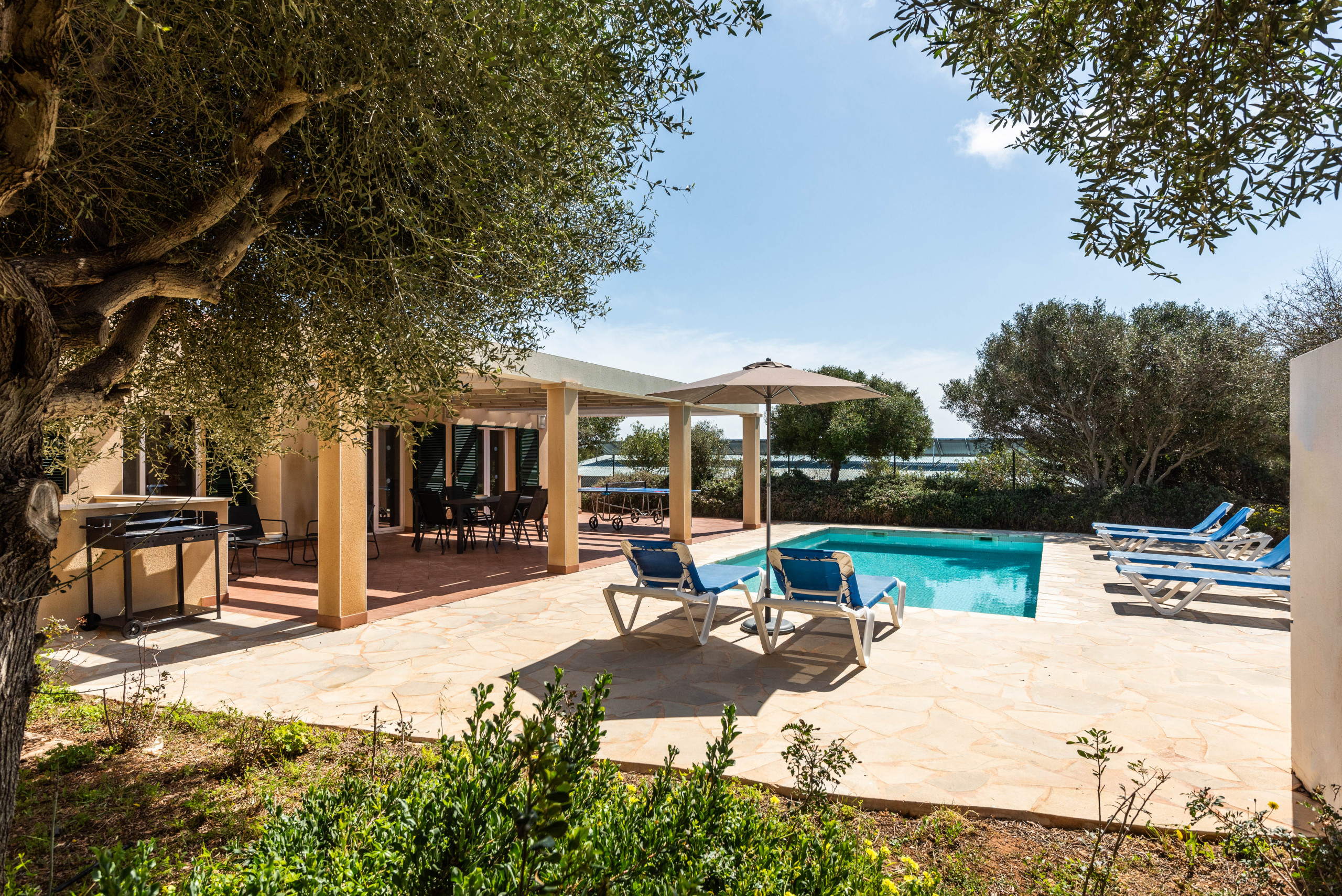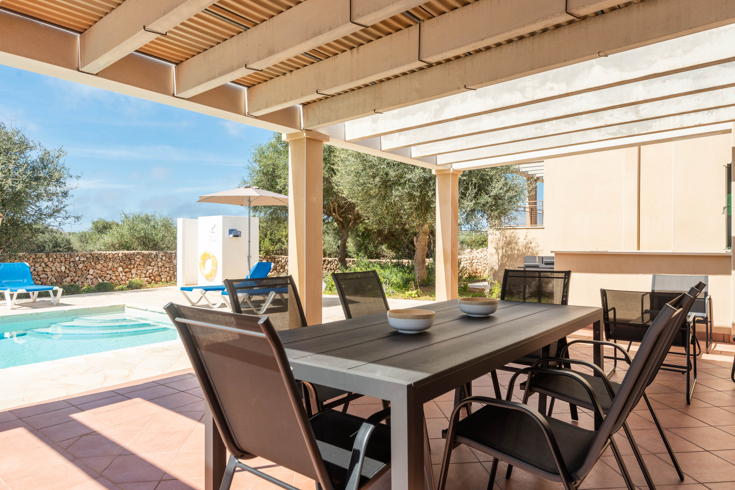 El exterior de la villa es un auténtico paraíso. Una amplia terraza te espera para compartir comidas al aire libre, tomar el sol o simplemente desconectar mientras los niños juegan en el generoso espacio junto a la piscina privada. Es el lugar perfecto para crear recuerdos inolvidables con familia o amigos.