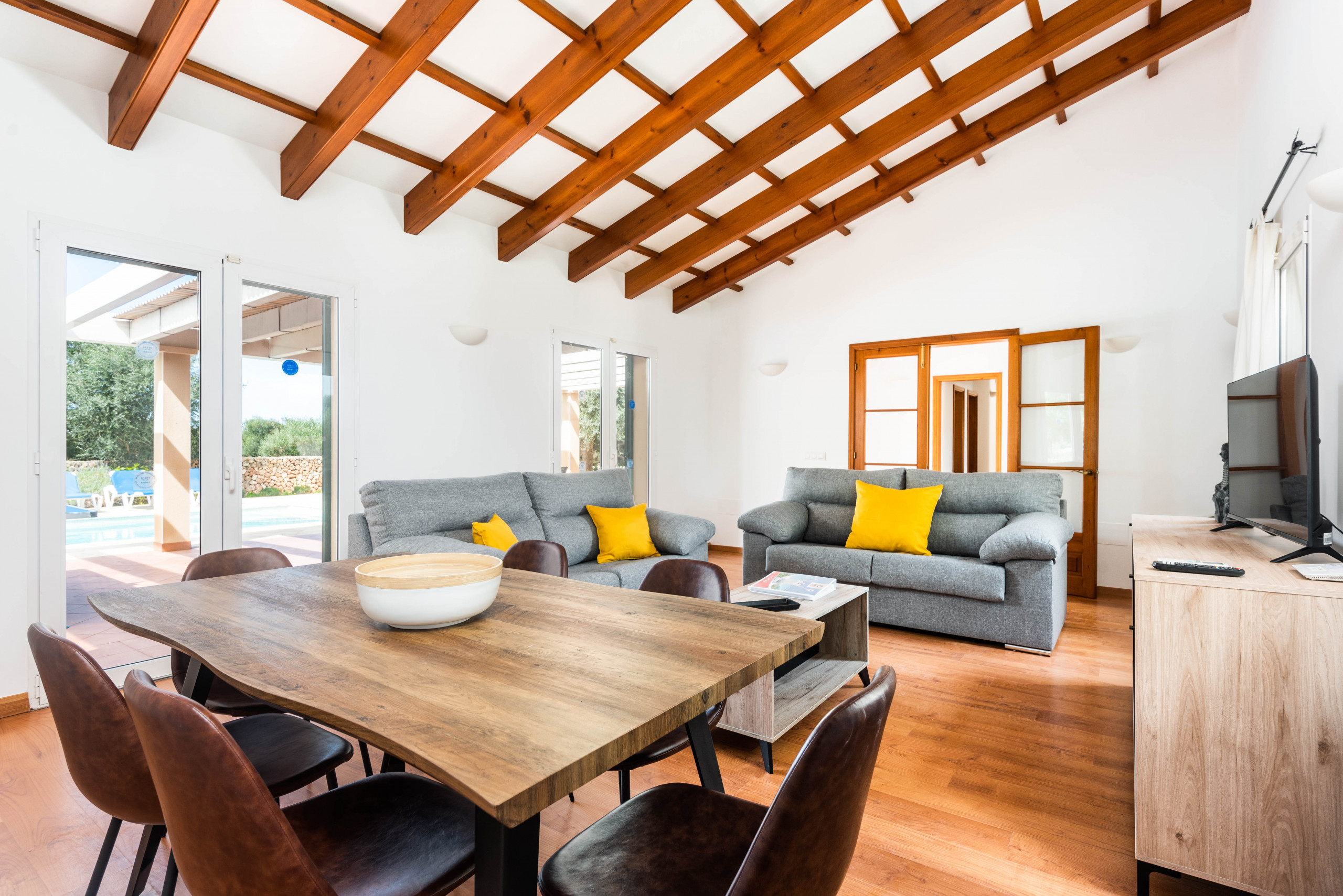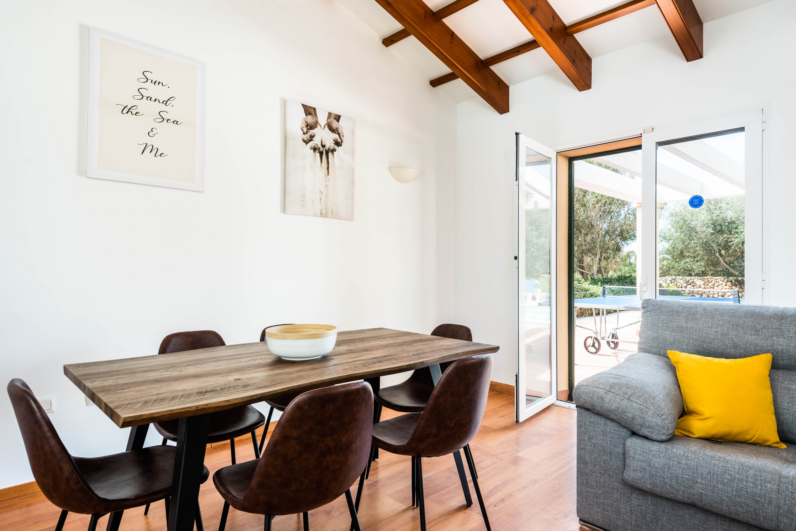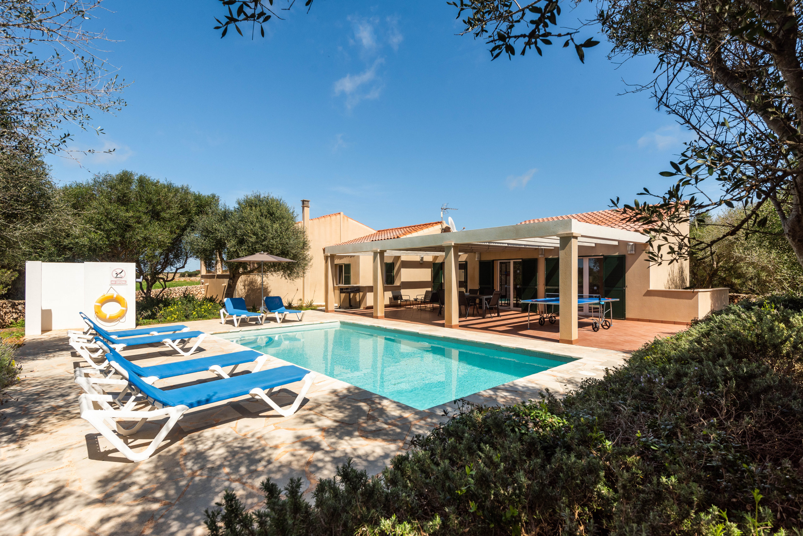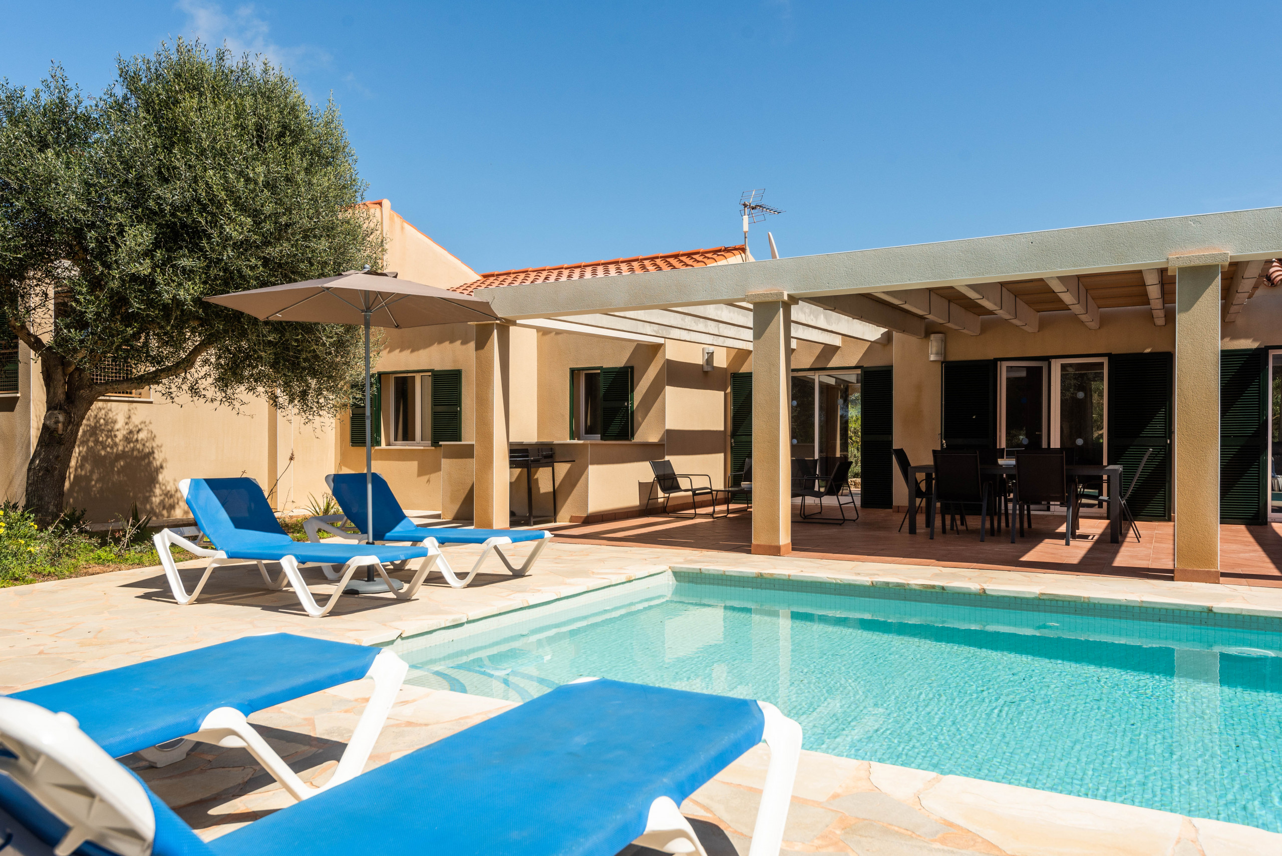 El exterior de la villa es un auténtico paraíso. Una amplia terraza te espera para compartir comidas al aire libre, tomar el sol o simplemente desconectar mientras los niños juegan en el generoso espacio junto a la piscina privada. Es el lugar perfecto para crear recuerdos inolvidables con familia o amigos.