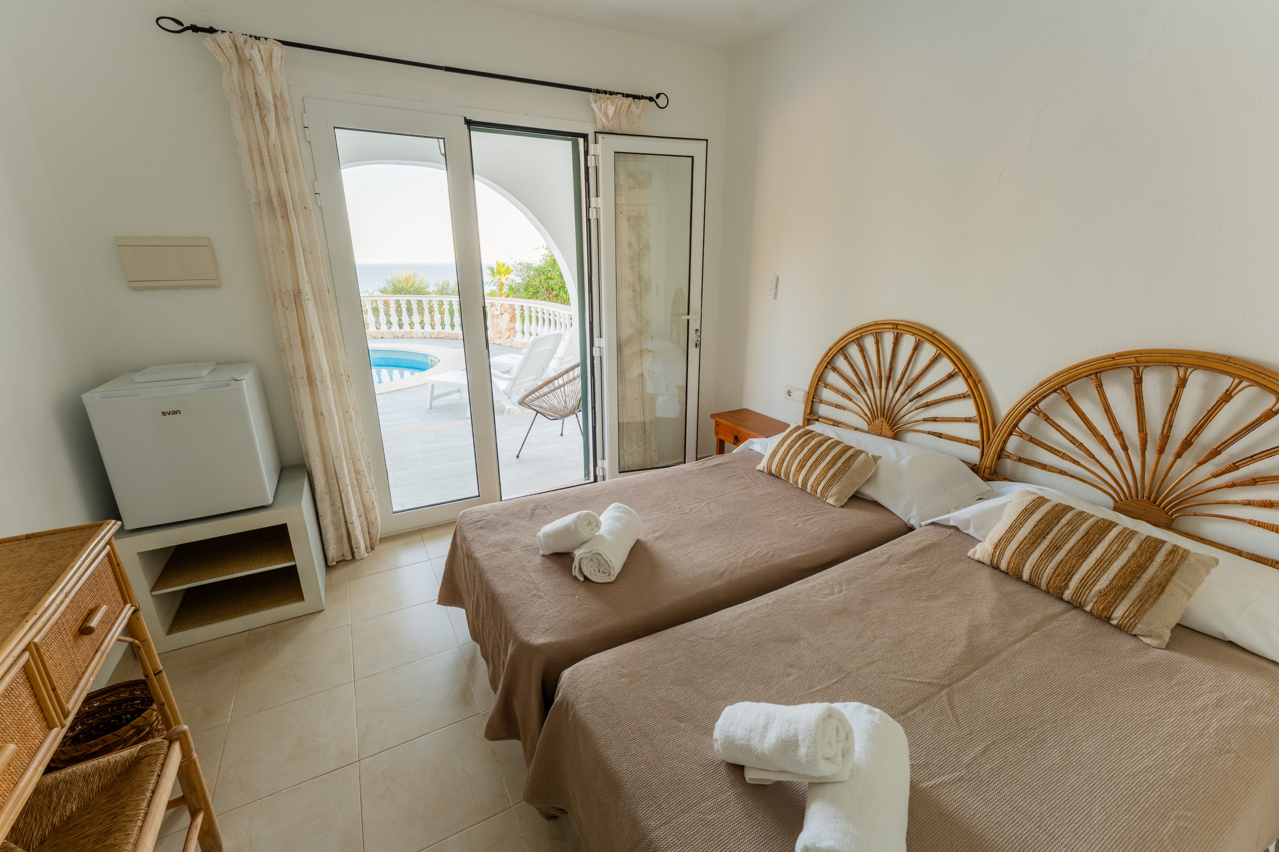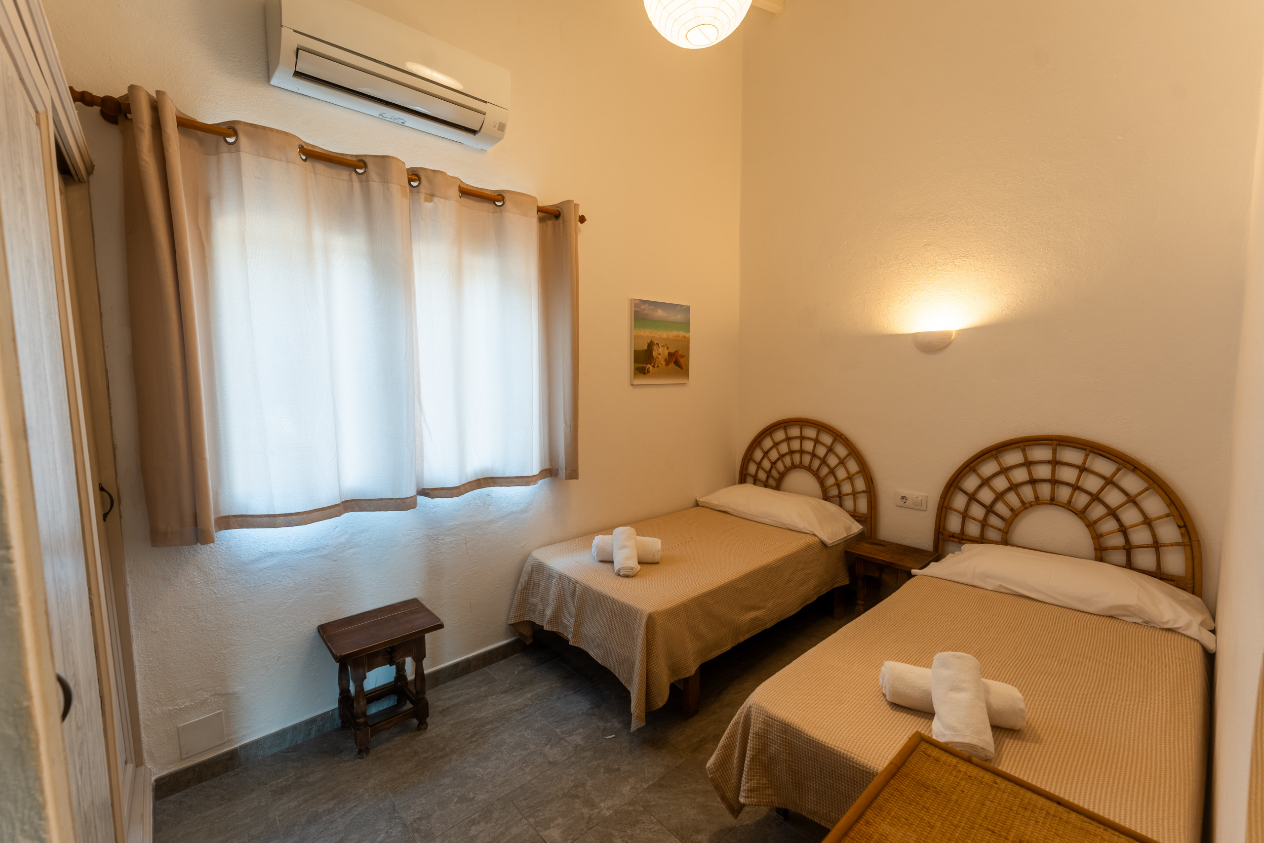 La villa dispone de 5 dormitorios con 7 camas (1 cama doble y 6 individuales), lo que permite una distribución cómoda para grupos familiares. Cada habitación está equipada con aire acondicionado para garantizar el máximo confort durante los días más calurosos.