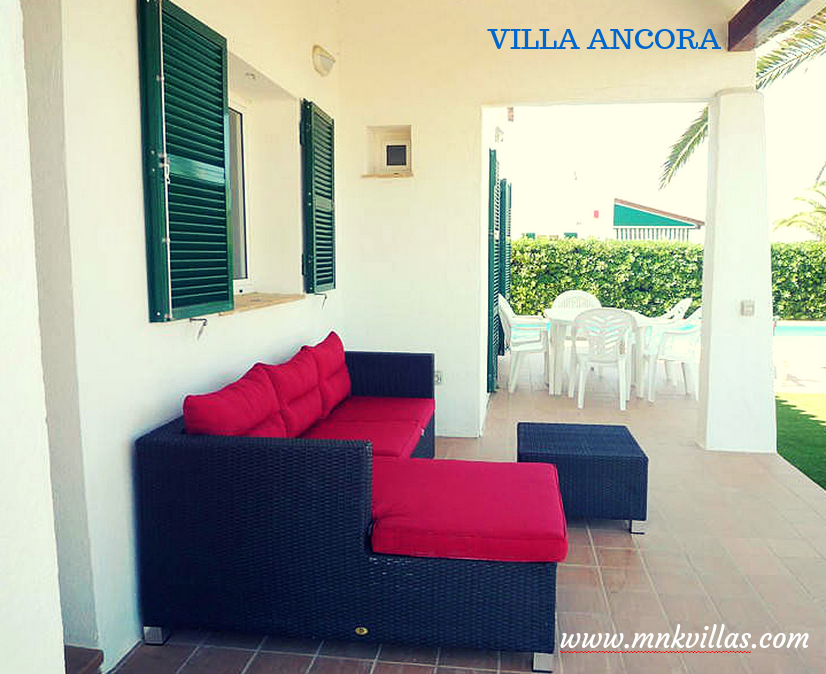 La Villa Ancora es para seis huéspedes y se trata de un bonito chalet ubicado en una zona de playa, en Binibeca. Tiene todo tipo de comodidades y hasta una zona cubierta con sillón y mesita para relajarse.