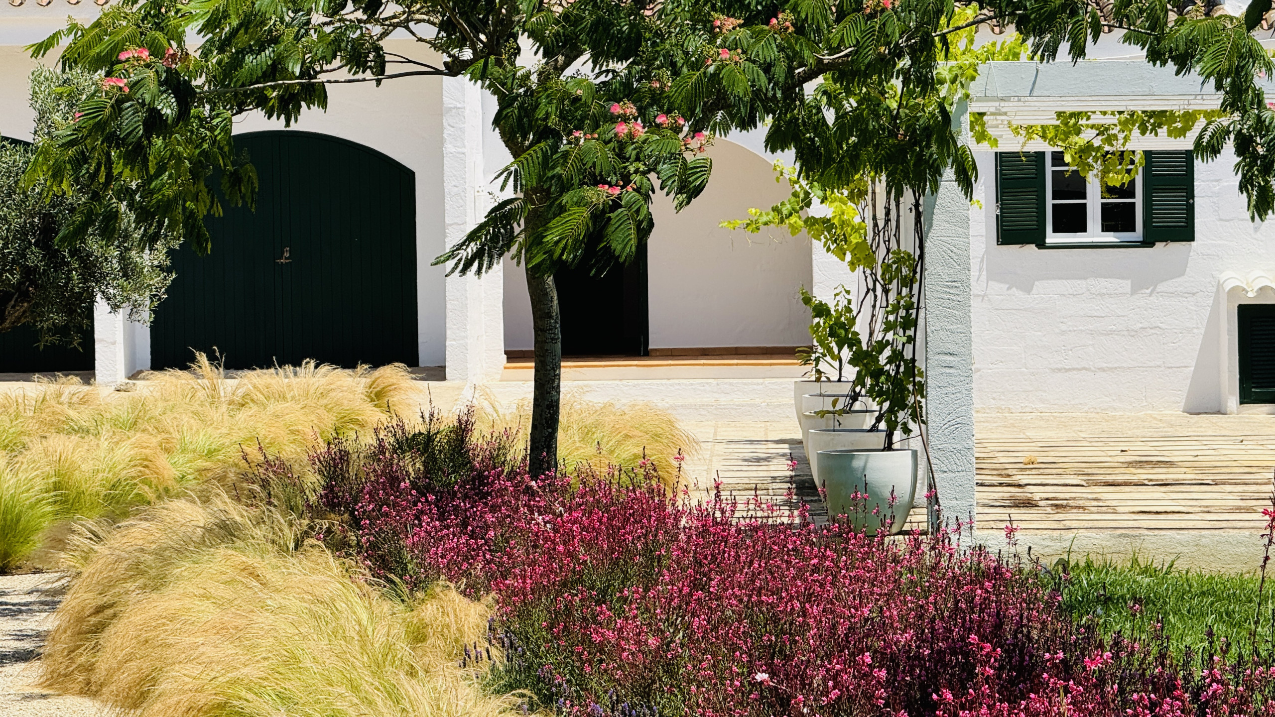 The land belonging to the house is approximately 11,000 square metres. The swimming pool is located on the east side of the house and measures 10 x 5 metres. Near the pool, there is a covered area for outdoor dining. The house's porch features typical Menorcan built-in sofas. The land has extensive lawn areas, olive trees, and several very peaceful areas where one can relax in the shade.