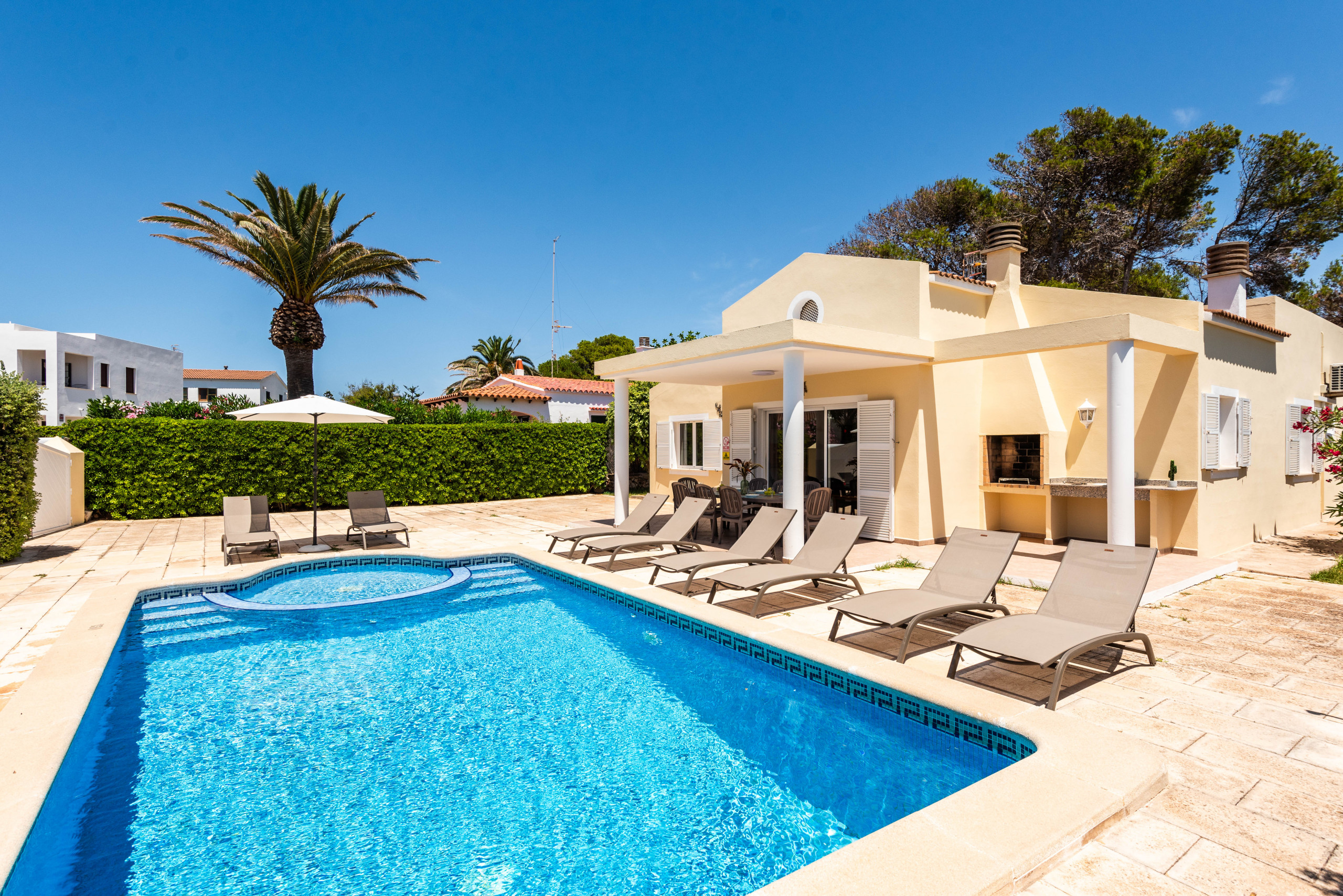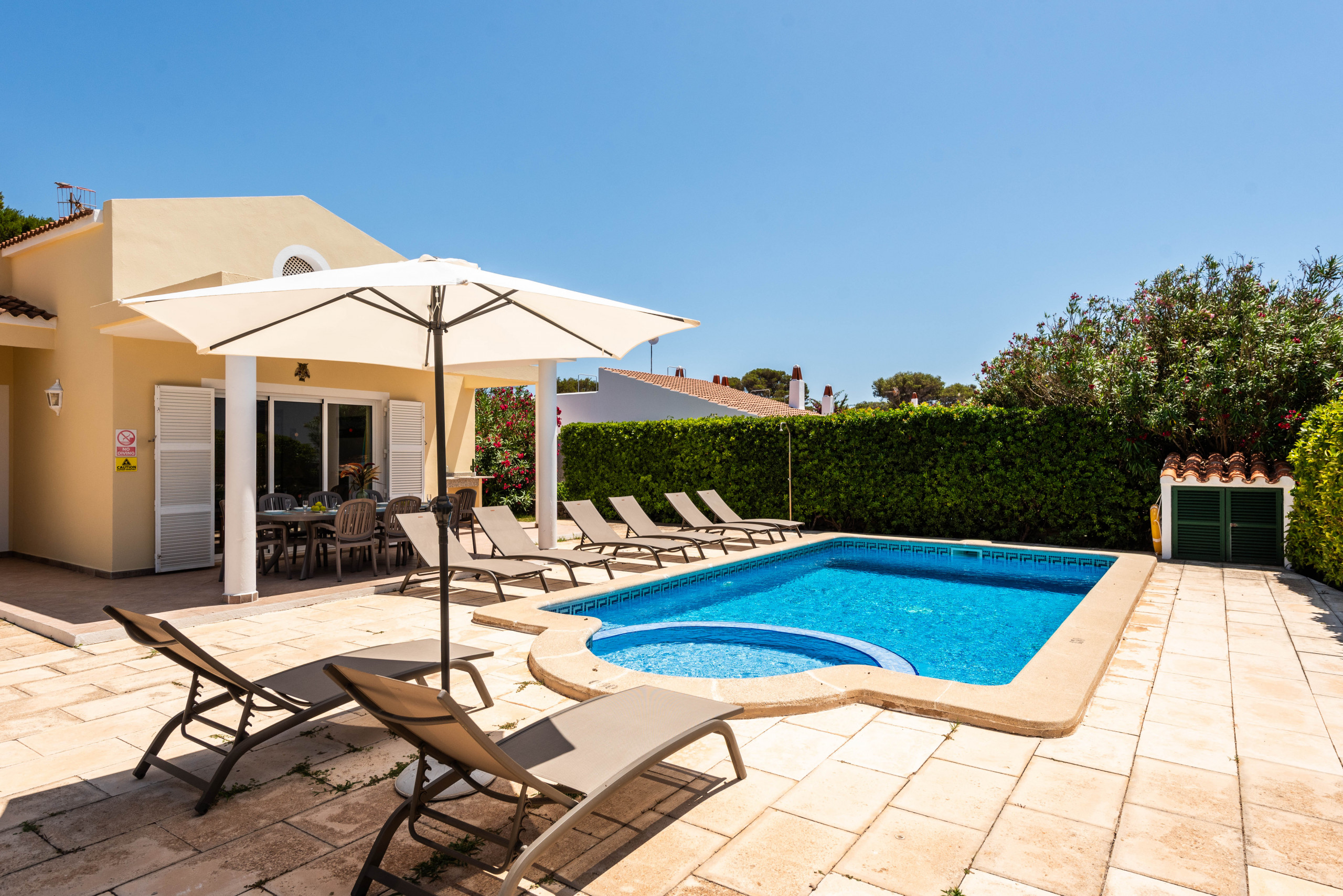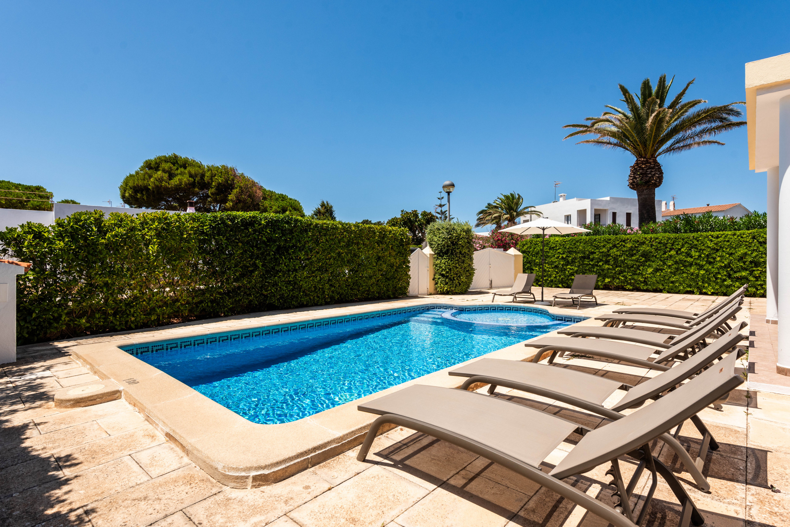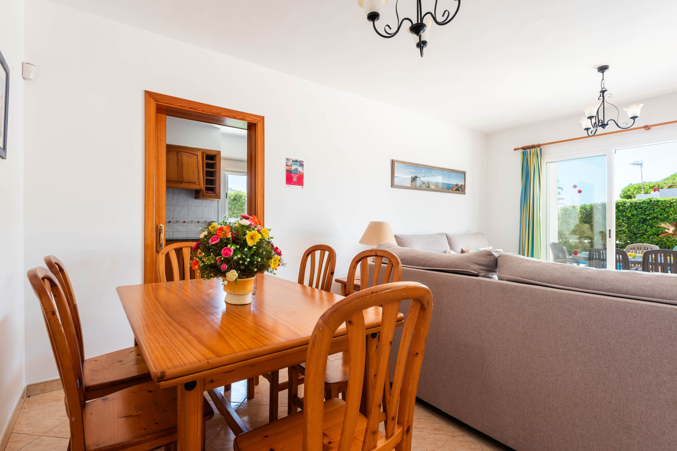 Entrance is directly into a light and airey lounge/dining area which has a beamed ceiling and an archway leading into the kitchen. The kitchen is fully equipped and is furnished in typical Menorquin lounge onto the shaded front terrace and the garden and pool area are just beyond.