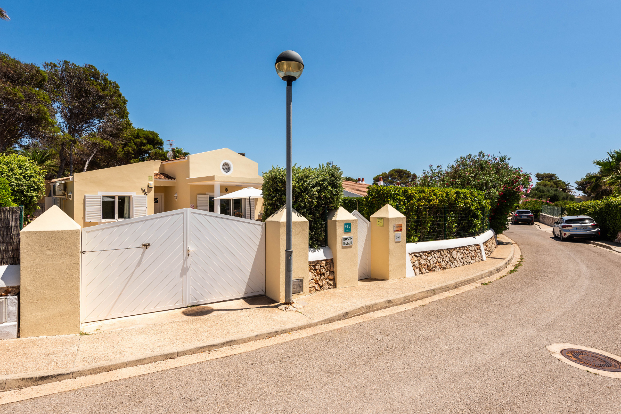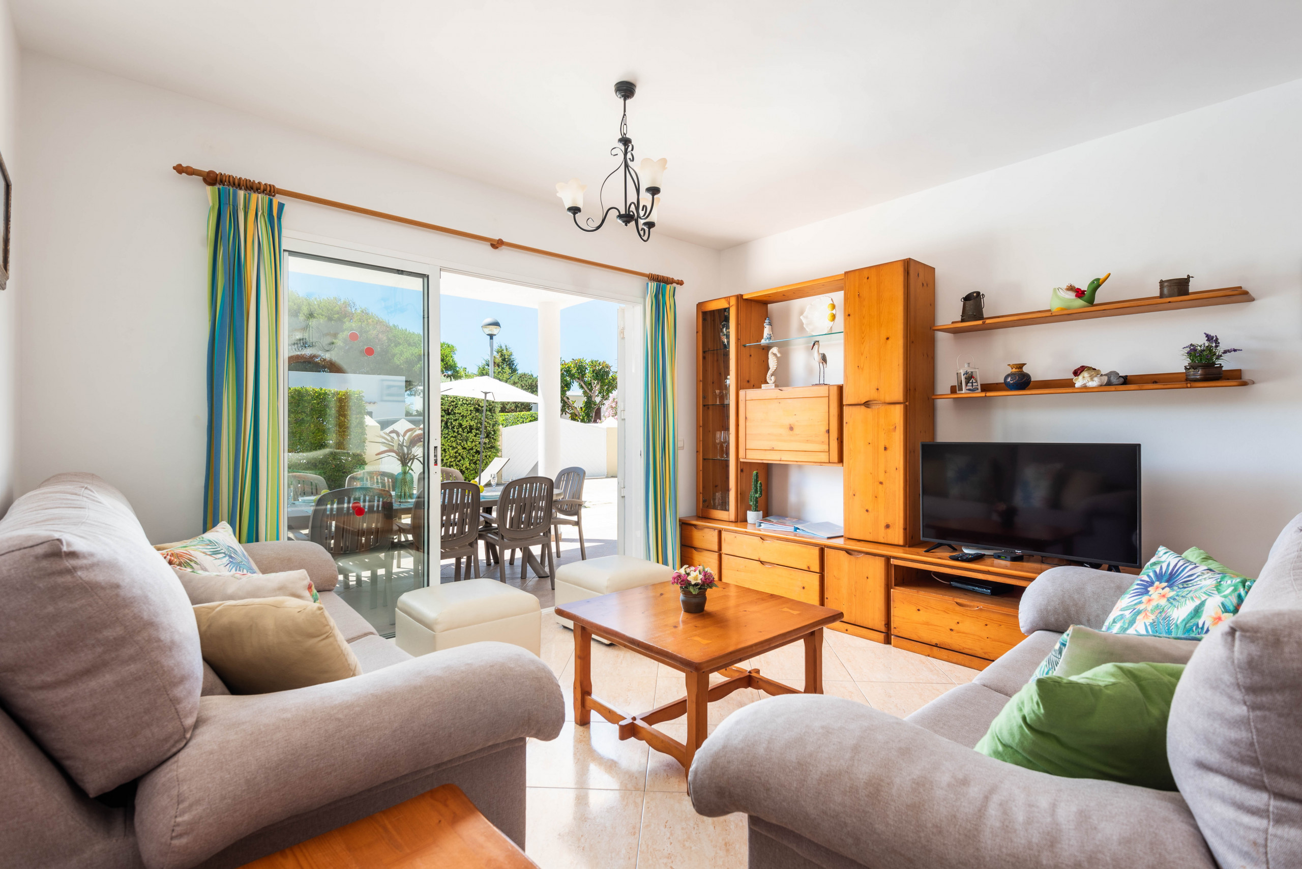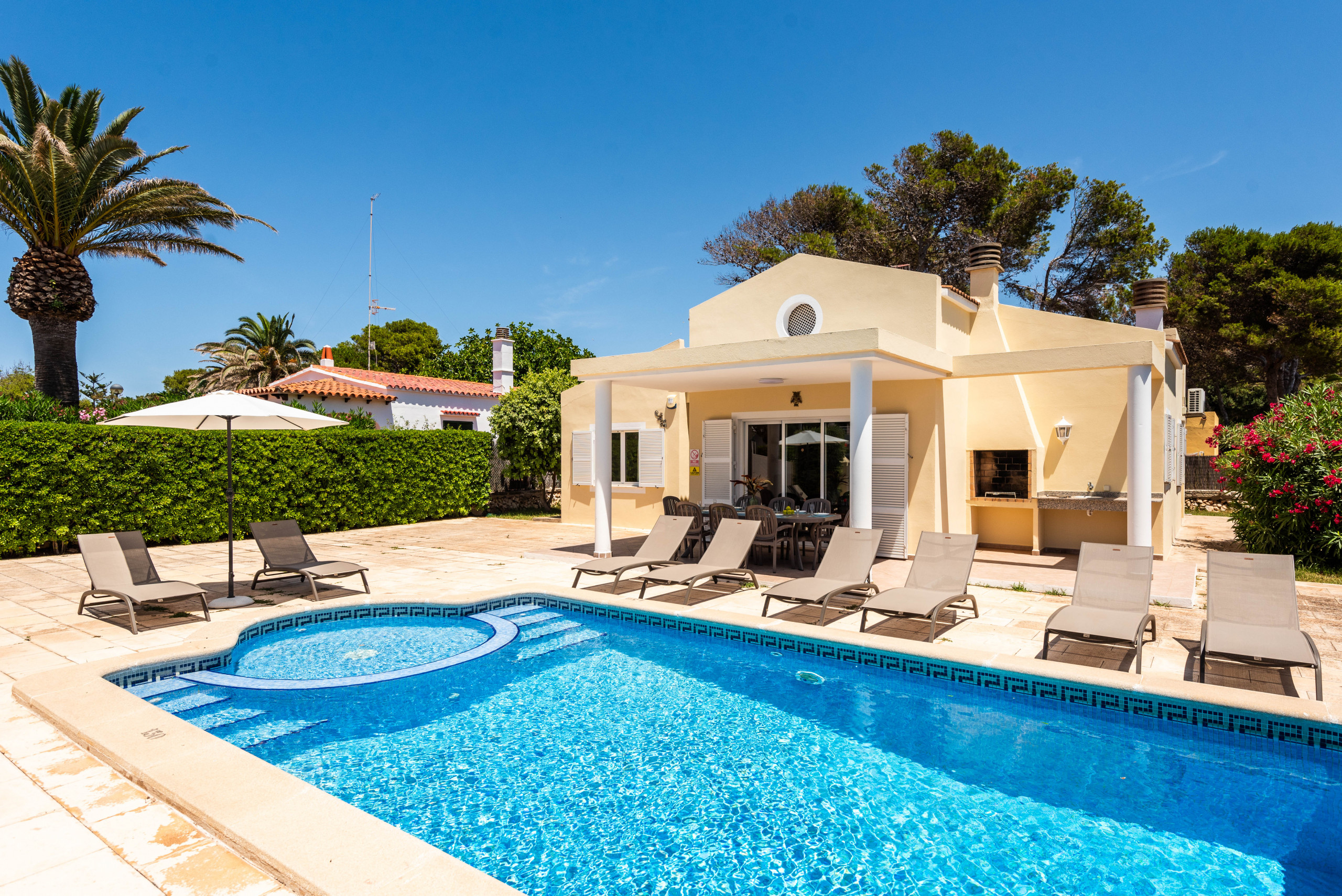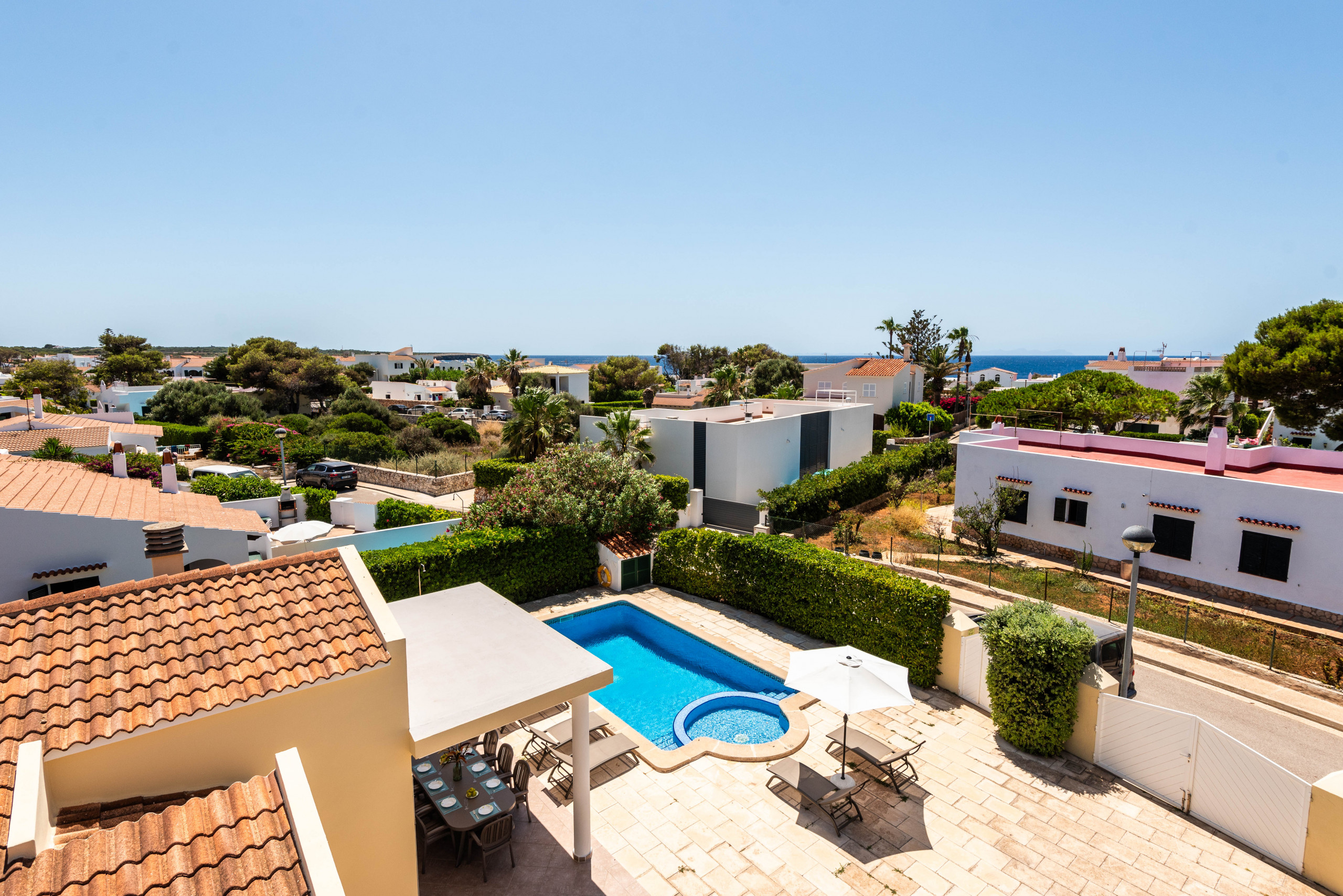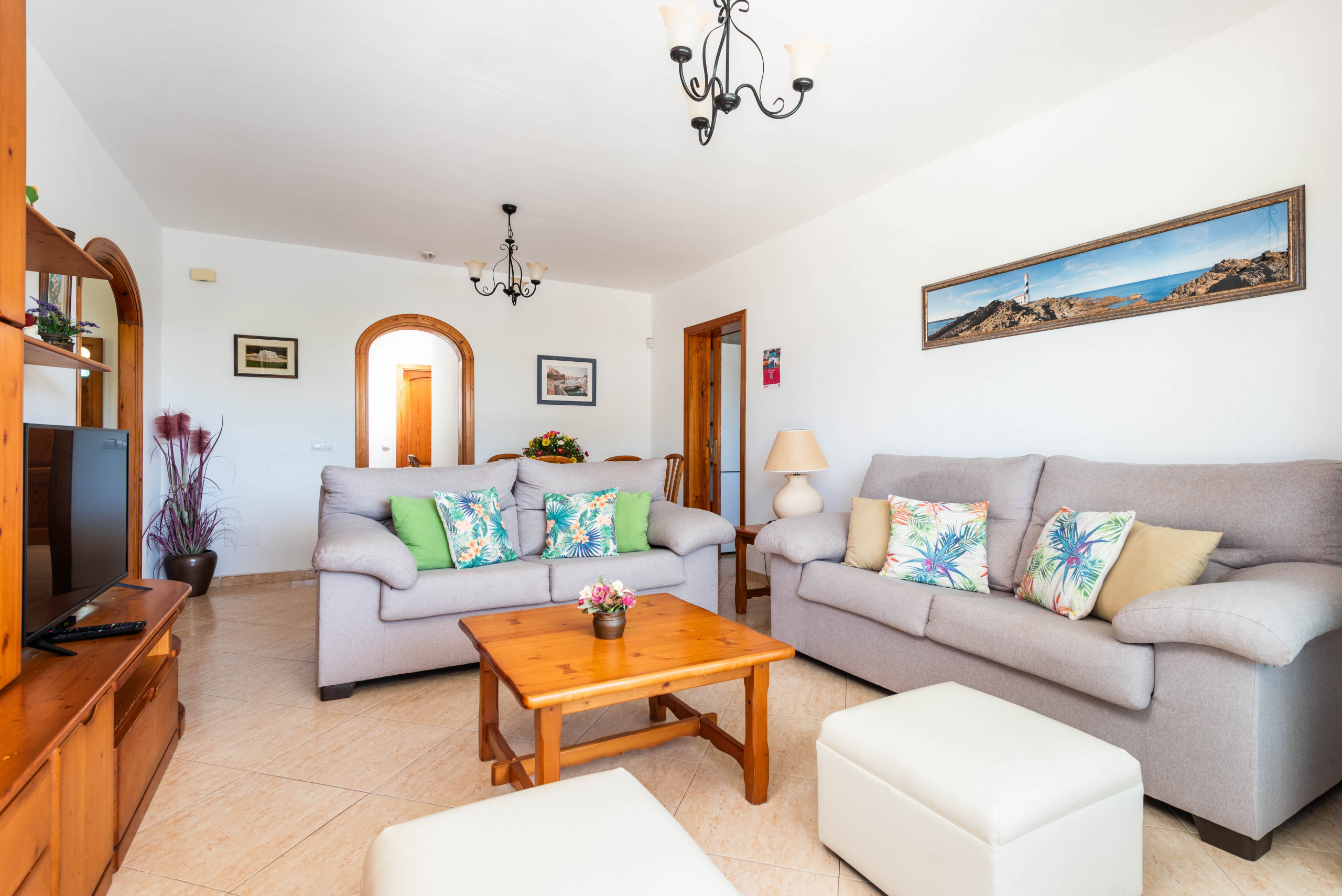 Entrance is directly into a light and airey lounge/dining area which has a beamed ceiling and an archway leading into the kitchen. The kitchen is fully equipped and is furnished in typical Menorquin lounge onto the shaded front terrace and the garden and pool area are just beyond.