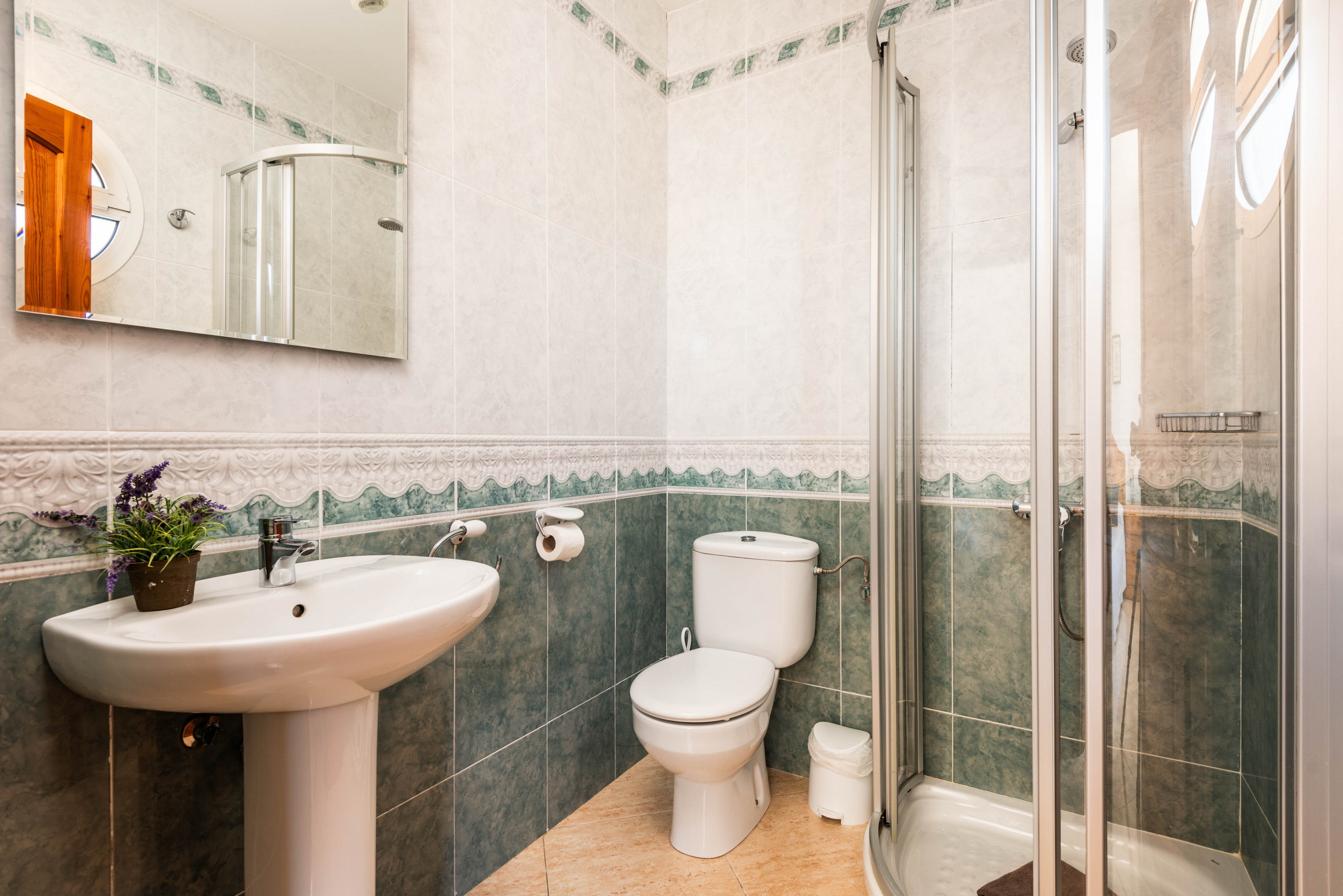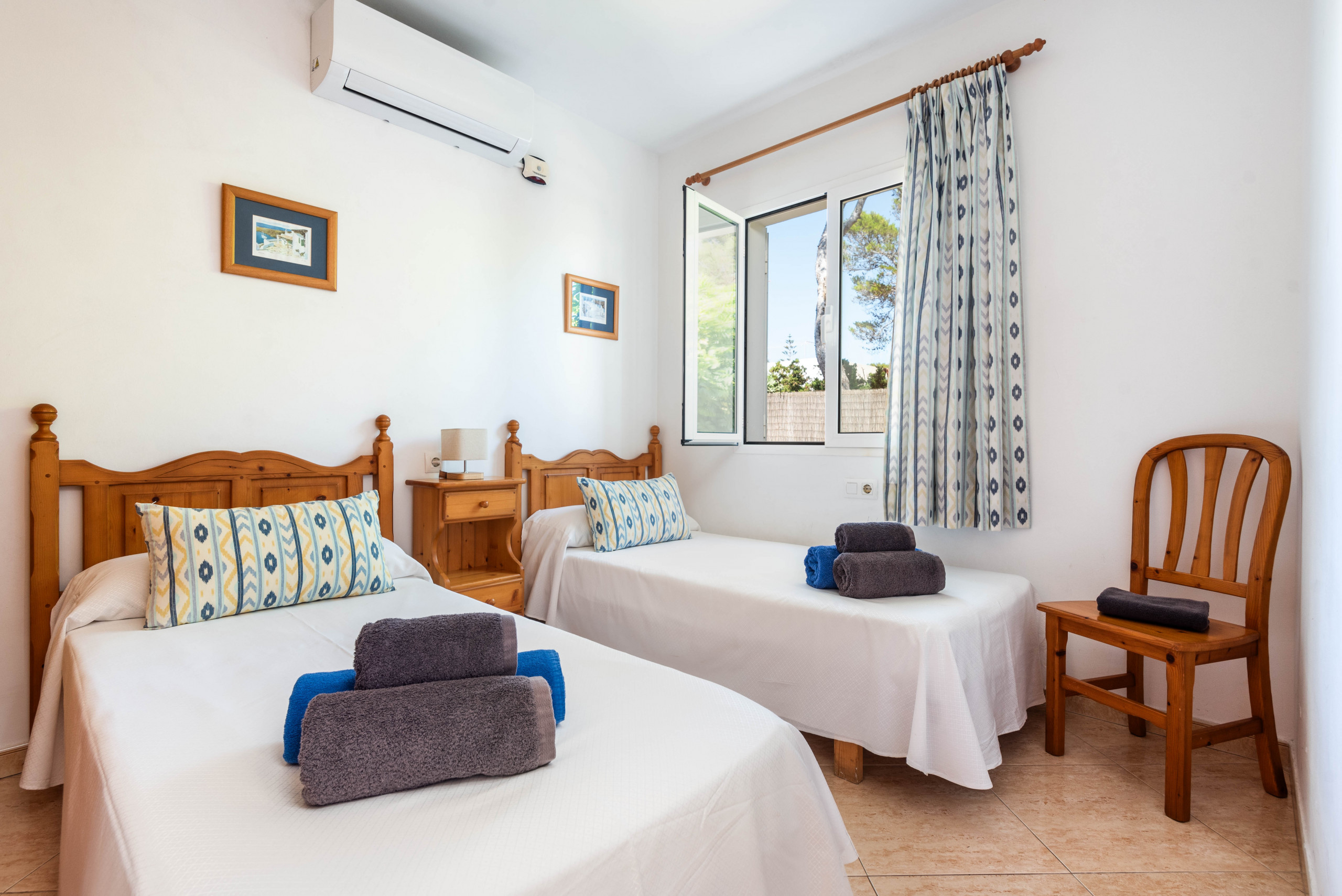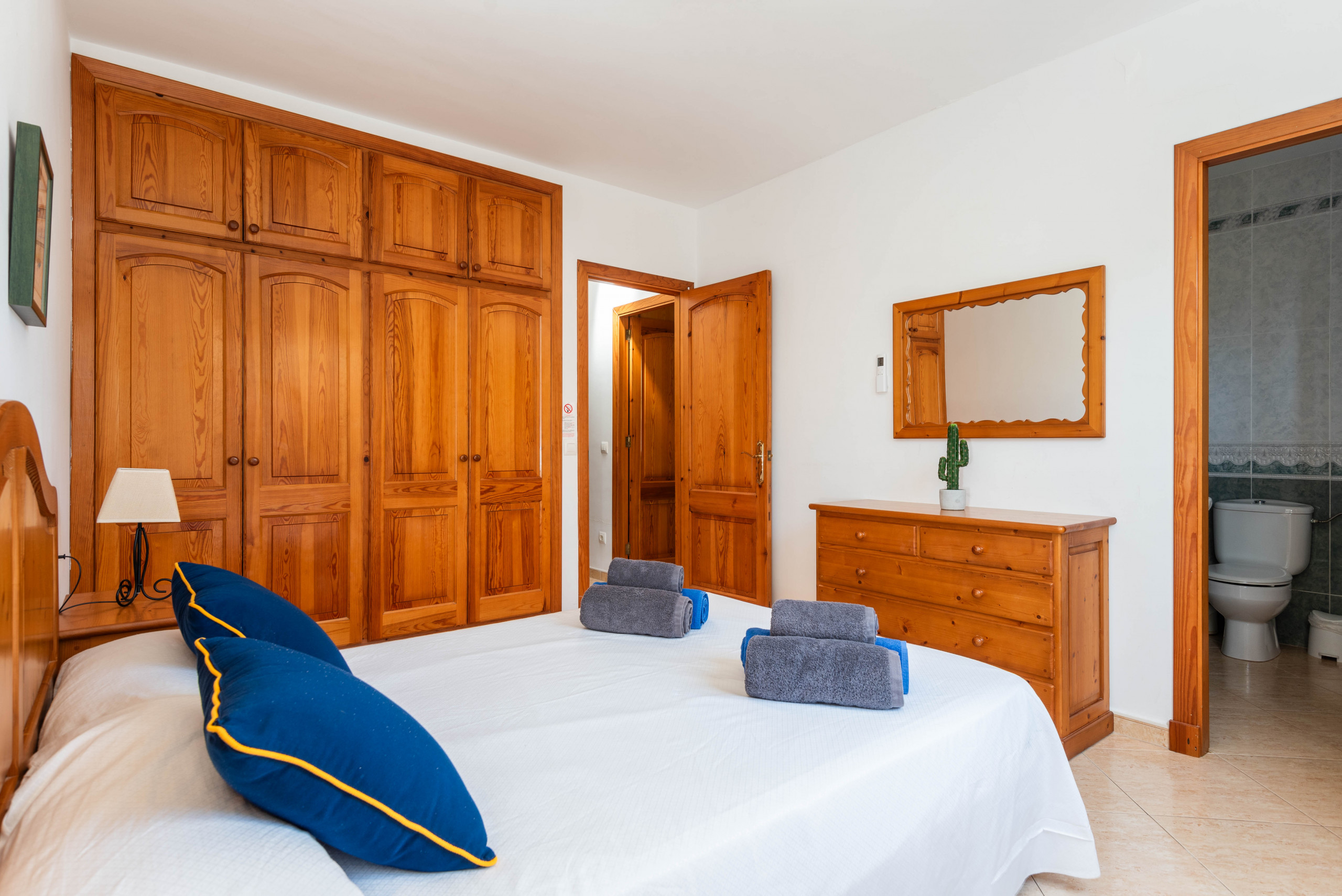 To the inmediate right of the front door is an archway leading through to the bedrooms. There is a twin bedroom wiht fitted wardrobes. Next door to this is the family bathroom and fully tiled in typical Menorcan style. A little further along the hallway is the double bedroom. This main bedroom has the facilities of an en suite bathroom. A second twin bedroom, also with fitted wardrobes, is situated immediately to the left.