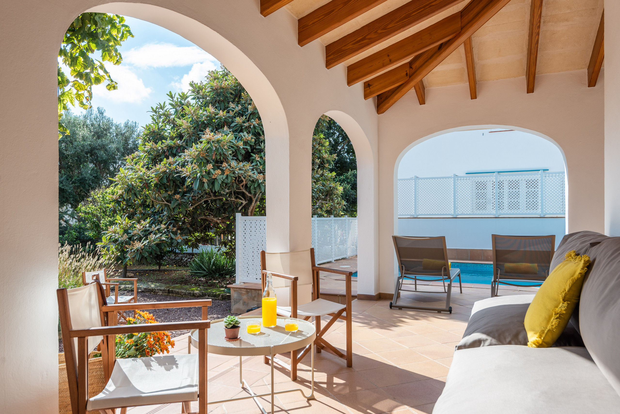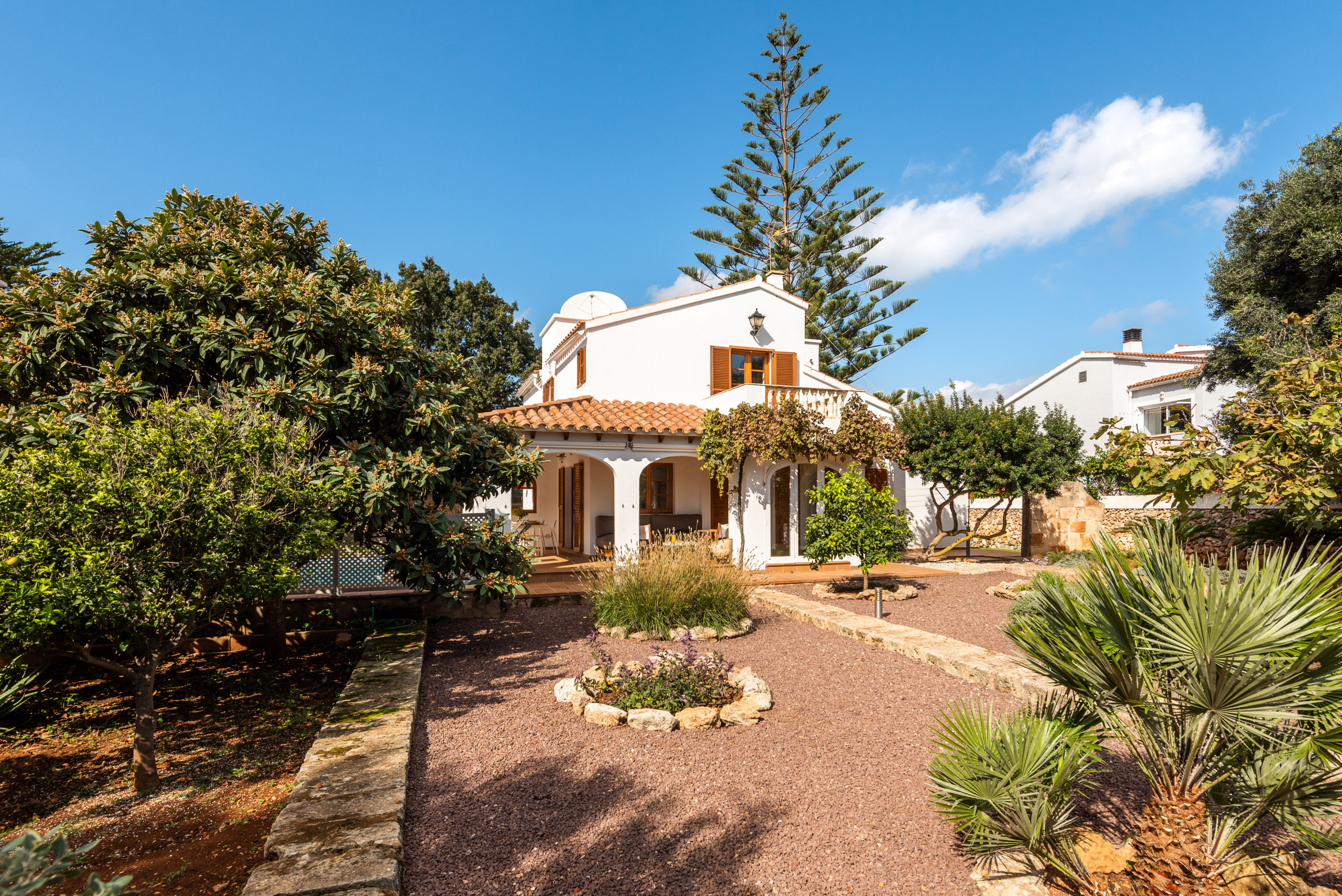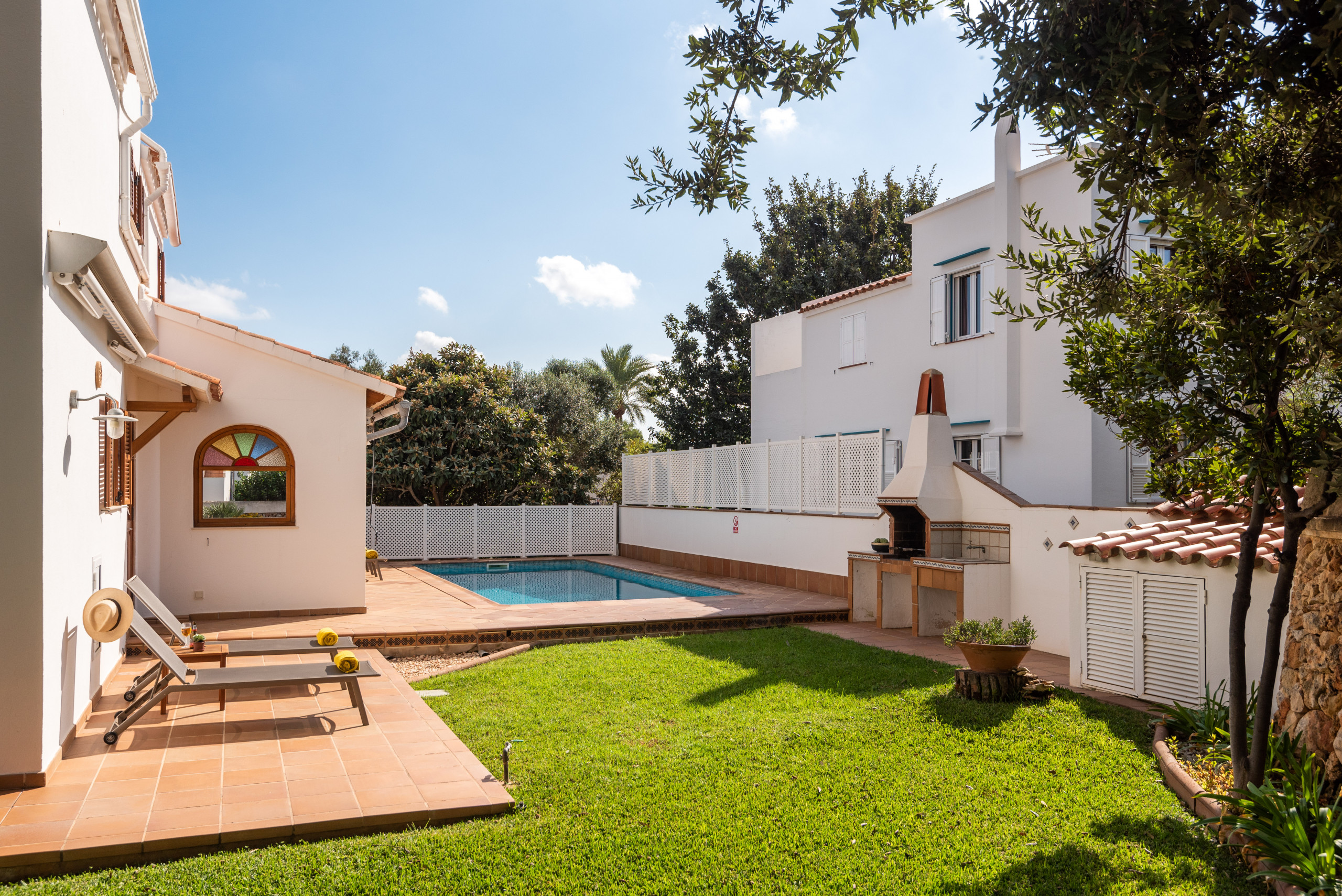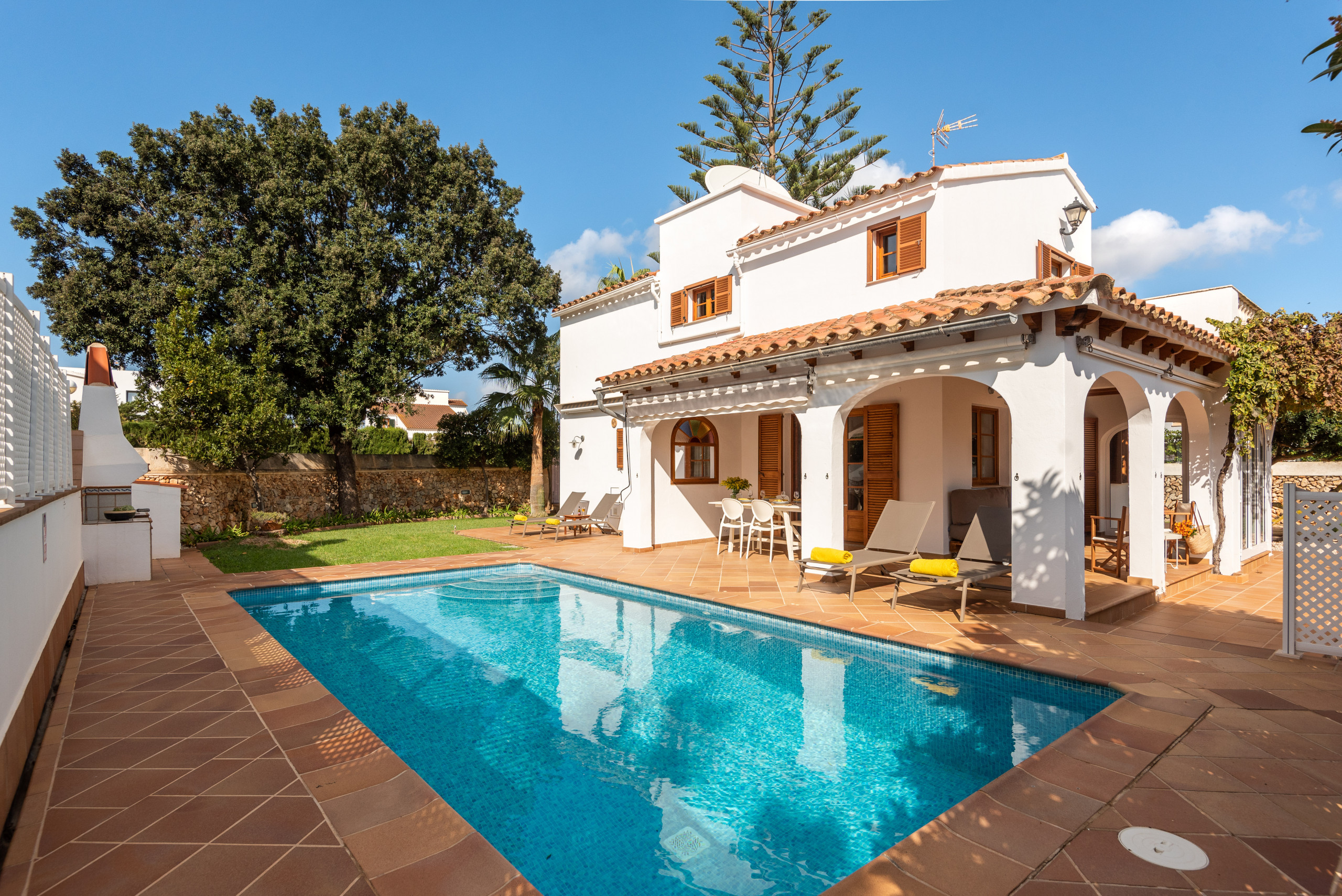 Elena, is a special accommodation in Mauter Villas. Elena, enjoy a large plot, where the vegetation, fruit trees, typical Menorca style orchard, make you enjoy nature in your own villa. It has a private pool, with child protection if desired. Pool, surrounded by deckchairs and a magnificent built-in barbecue! Inside is ideal. Very complete kitchen with nespresso coffee machine and much more, living room with new sofas from 2021 because we always think about your comfort, and from the living room and kitchen, access to a large terrace, with chillout-style furniture, to be able to enjoy the summer afternoons. Rooms for 7 people, with the option of adding 1 supplement at a cost per night. Located in a cul-de-sac, very quiet, just 400 meters from the sandy beach! Elena, it is a magnificent villa, where everyone who goes, wants to return!