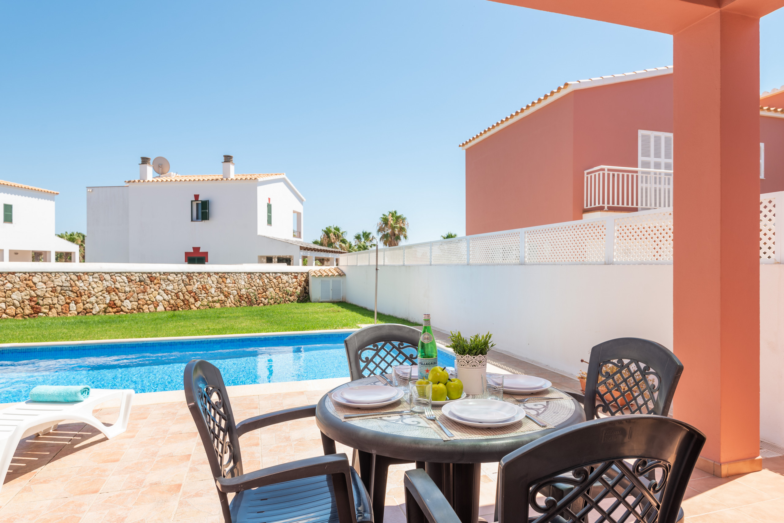 Villa Bay, distributed over 2 floors, with 3 bedrooms (2 with air conditioning and 1 with fan), ground floor with living room and fully equipped independent kitchen. Large outdoor lawn area, wonderful, and beautiful pool where you can enjoy a swim. It has a portable barbecue, in case you want to have a barbecue with the family. You have the great luck of being 1 km from Ciutadella, with access bordering the sea, to be able to enjoy a walk towards Ciutadella, seeing the Mediterranean.