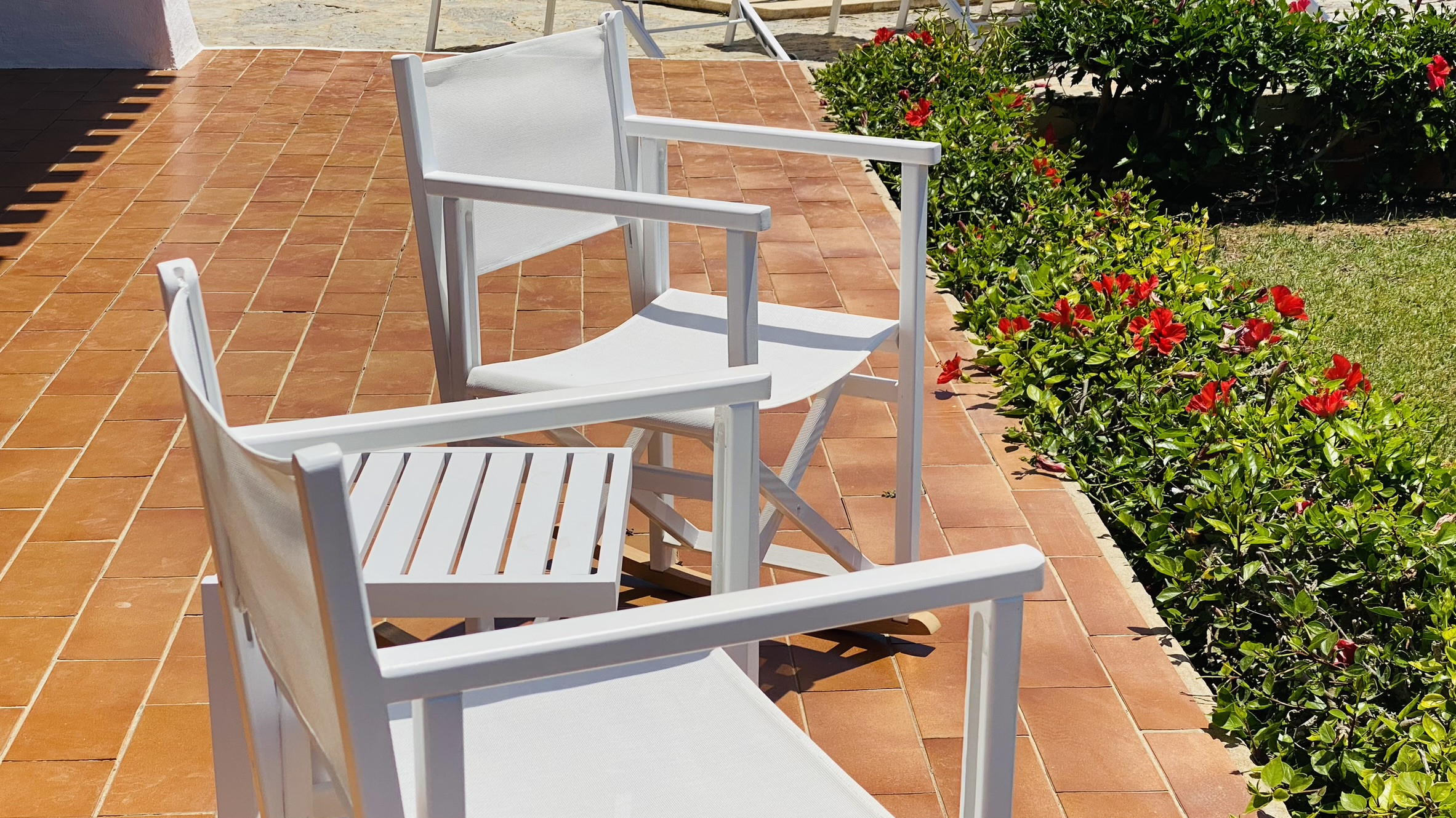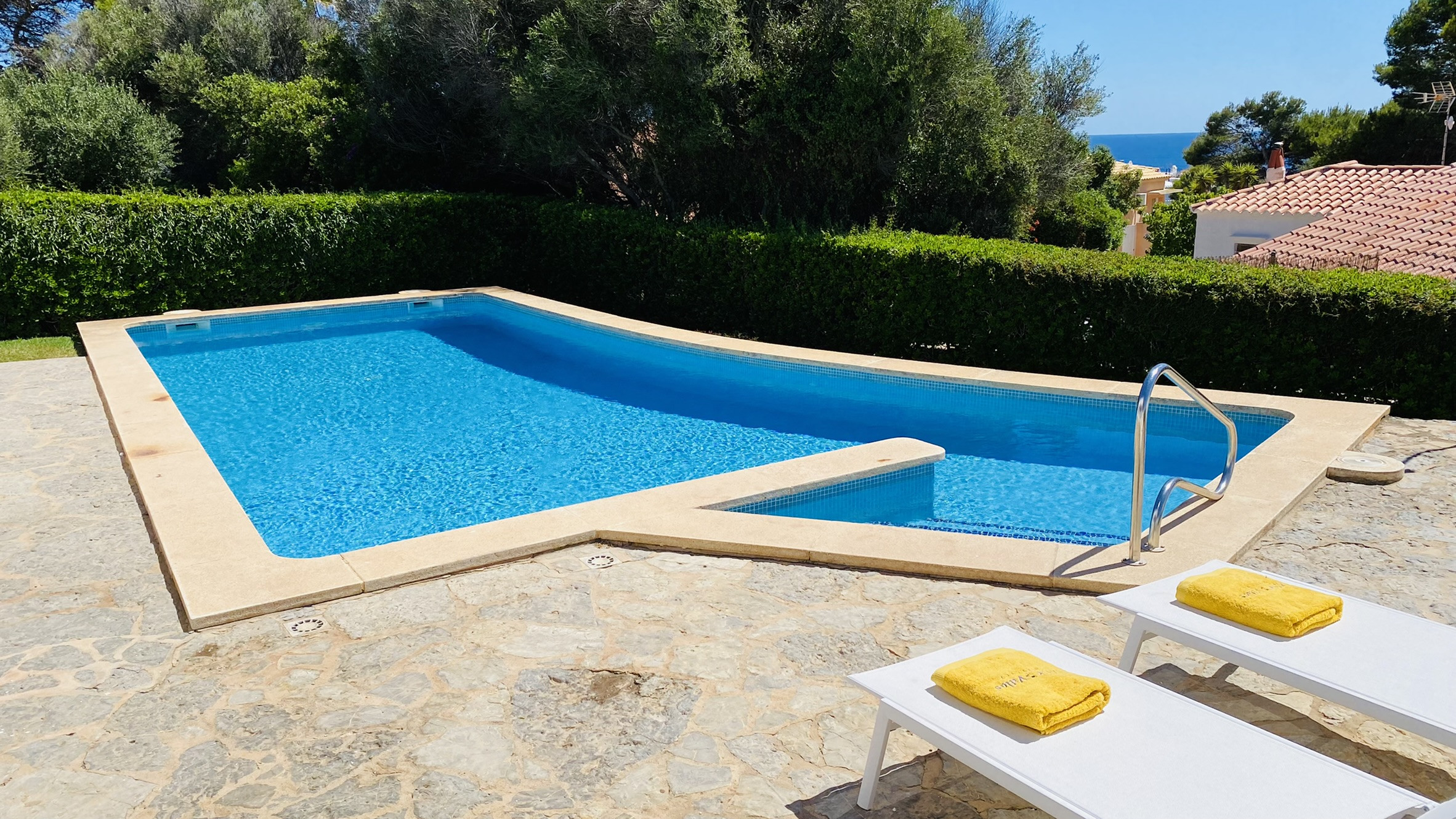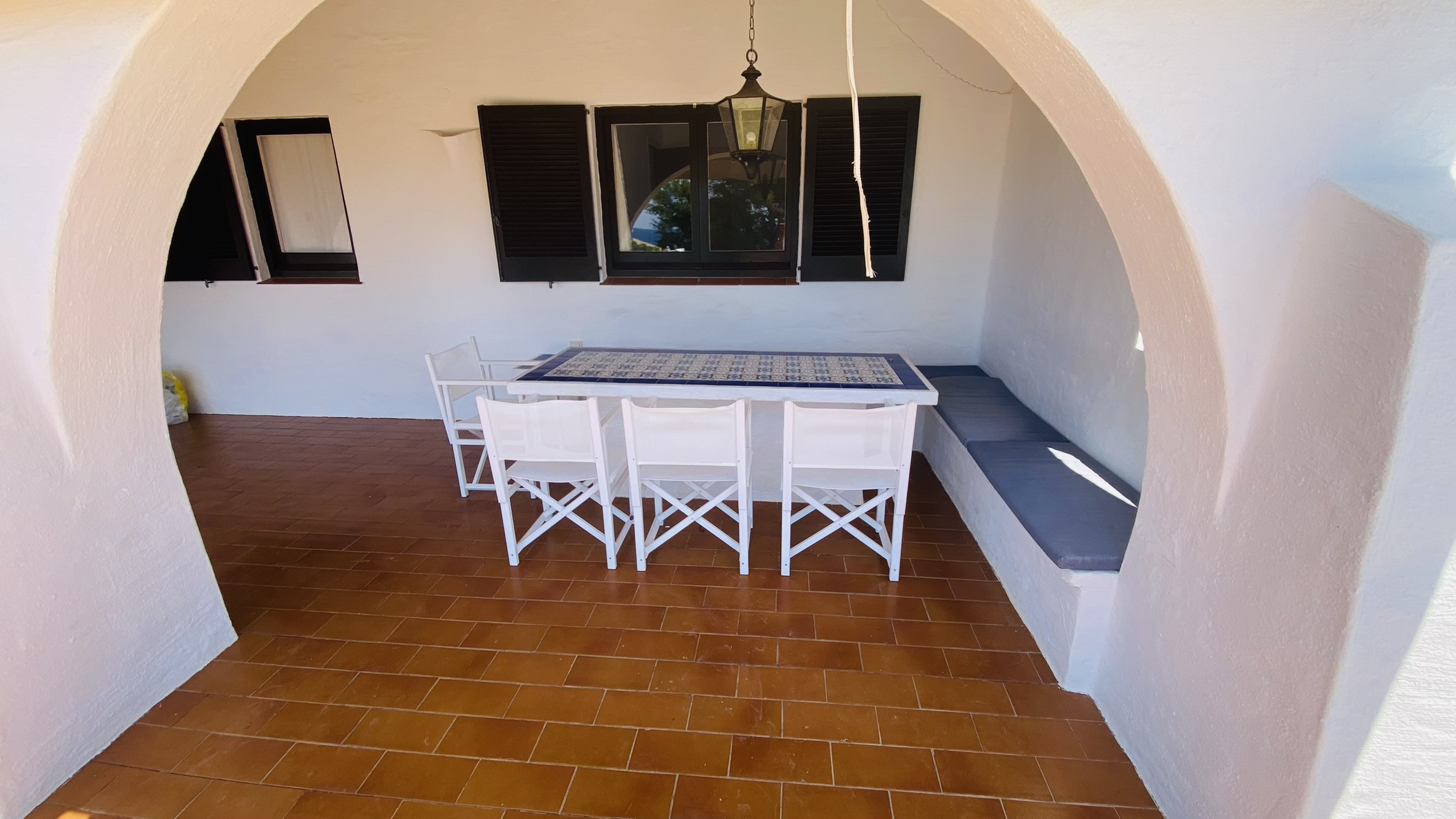 La maison dispose d'un large porche avec une vue partielle sur la mer, meublé d'une table et de bancs en maçonnerie pour manger en plein air. La piscine (8m x 4m) dispose de marches en maçonnerie pour y accéder et est entourée de gazon et de terrasses pour prendre le soleil. Le jardin comprend une grande zone enherbée.