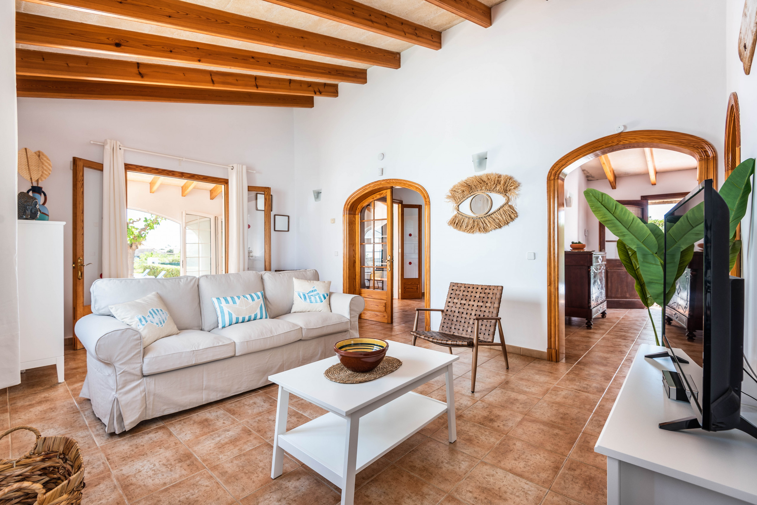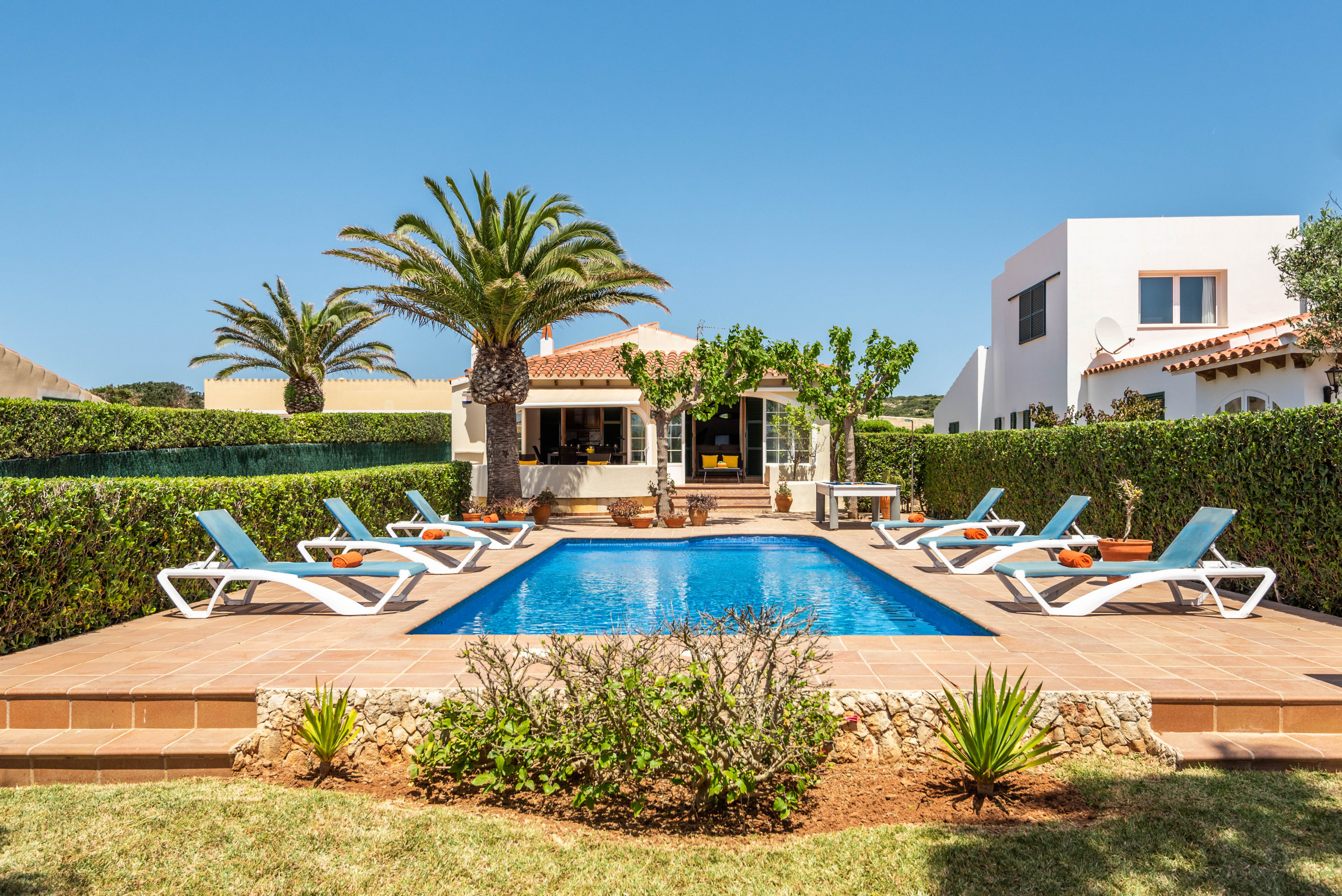 Villa à Cala´n Blanes qui possède 3 chambre(s) et Capacité pour 6 personnes. Logement de 140 m² accueillant et très lumineux, avec vue sur le jardin et la piscine. La location se trouve à 700 m de la plage de sable "CALEN BLANES", 7 km de la ville "CIUTADELLA" et il est situé dans une zone idéale pour familles zone et dans la zone urbaine.Elle dispose de jardin, mobilier de jardin, clôture, 30 m² de terrasse, lave-linge, barbecue, fer à repasser, accès internet (wifi), sèche-cheveux, chauffage pompe à chaleur, climatisation dans toutes les chambres, piscine privée, parking extérieur même bâtiment, TV, tv satellite (Langues: Espagnol, Anglais, Allemand), radio.La cuisine indépendante, à vitrocéramique, est équipée avec réfrigérateur, micro-ondes, four, congélateur, lave-vaisselle, vaisselle/couverts, ustensiles/cuisine, cafetière, grille pain, bouilloire et presse-agrumes.
