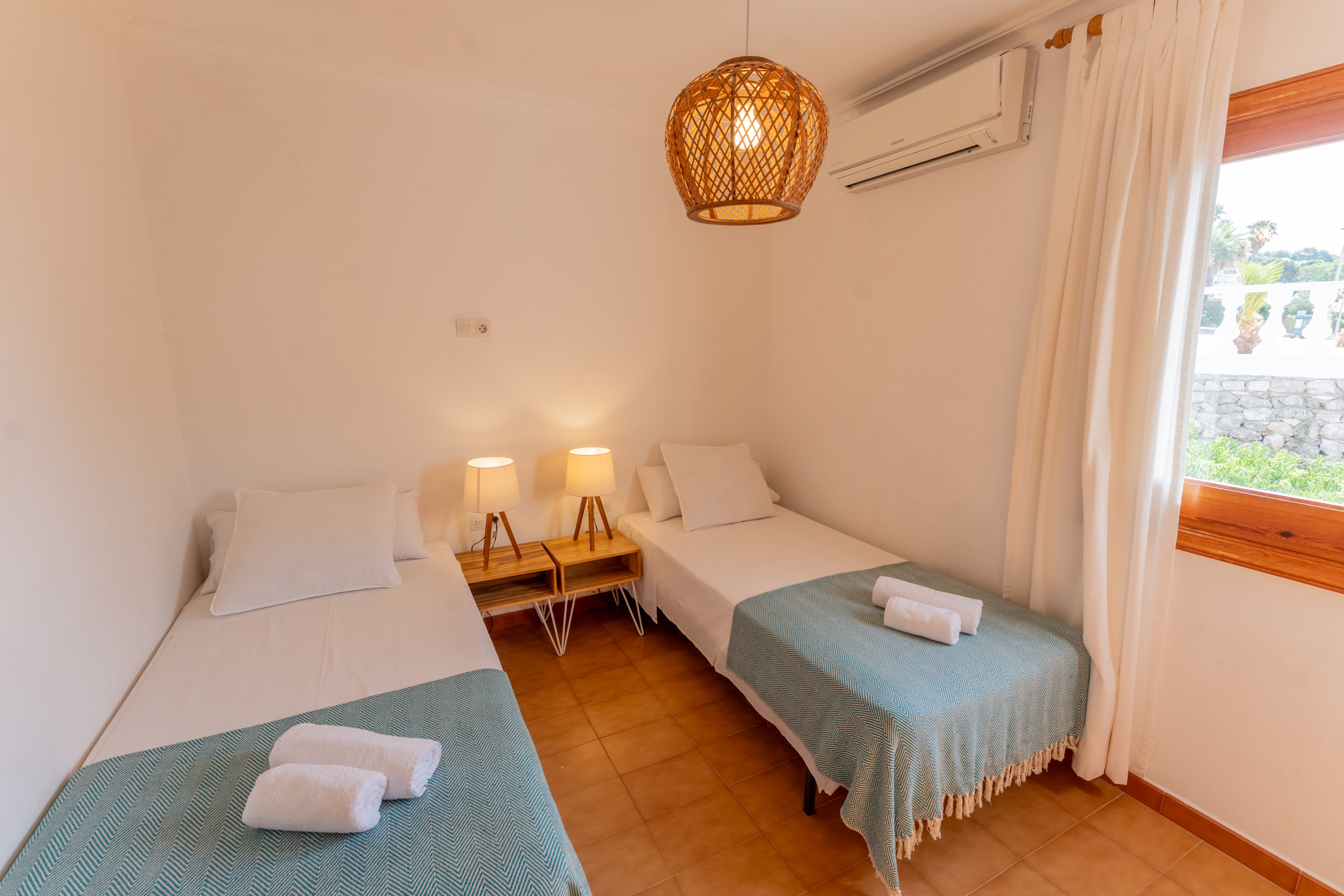 L'intérieur de la villa est entièrement climatisé avec la climatisation et offre 4 chambres avec 6 lits (2 doubles et 4 individuels), ce qui permet une distribution flexible pour différents types de groupes. Elle dispose de 3 salles de bains, 2 avec douche et 1 avec baignoire, facilitant la cohabitation des invités.
