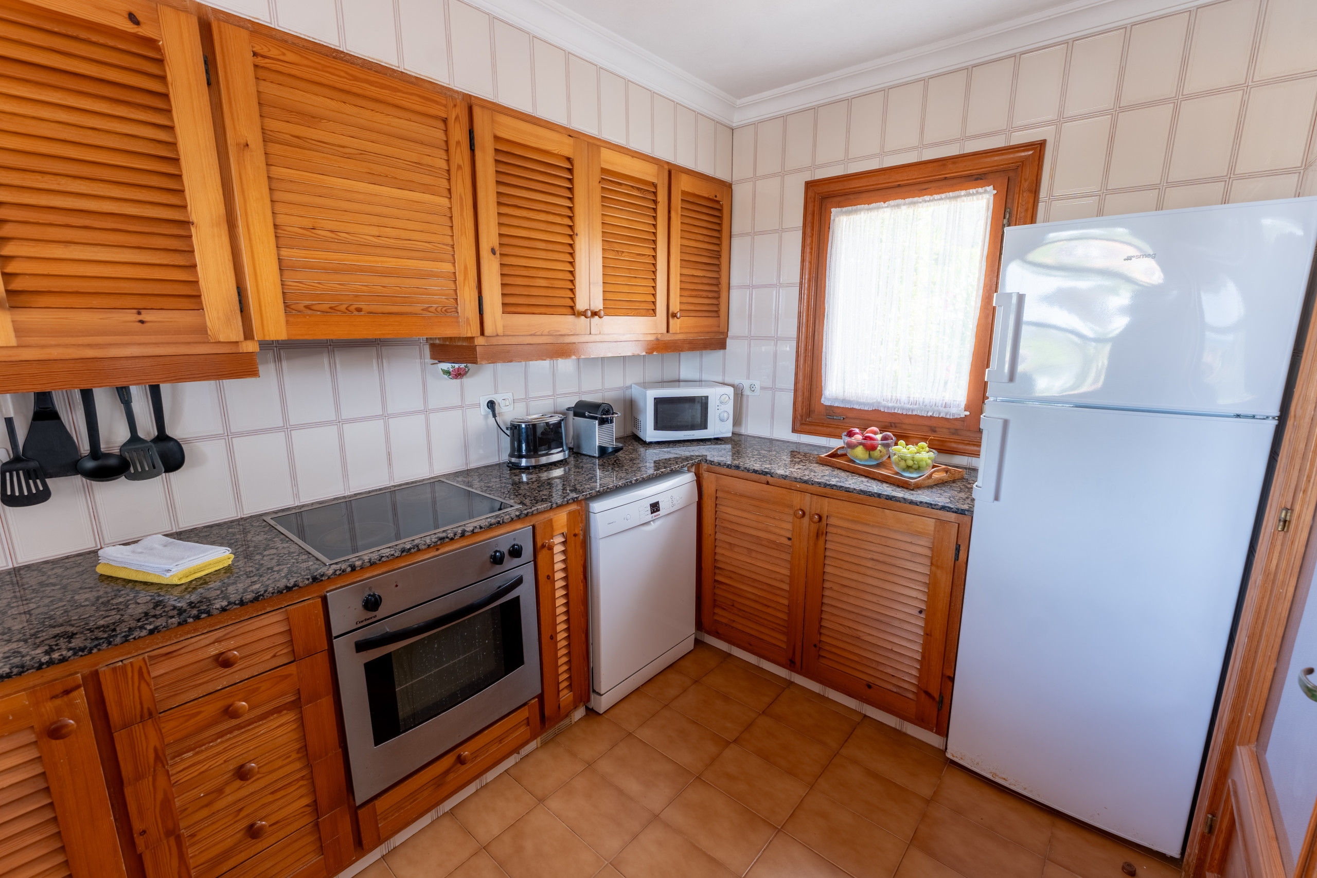 La cuisine américaine est entièrement équipée d'appareils électroménagers modernes tels que lave-linge, lave-vaisselle, four, micro-ondes, cafetière, grille-pain et bouilloire. De plus, elle dispose d'une connexion WiFi et d'une télévision avec des chaînes en espagnol, anglais et allemand.